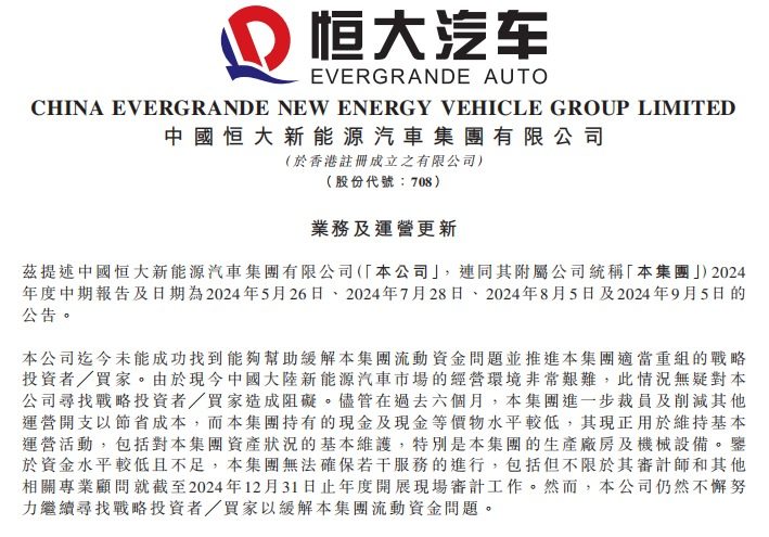 图片来源:恒大汽车公告 在此之前,恒大汽车曾遭遇了两位“白衣骑士”的中途“退场”。2023年8月,恒大汽车发布公告称,其获得由阿联酋国家主权基金持股的上市公司纽顿集团战略投资,交易完成后,纽顿集团对恒大汽车持股比例占扩大后已发行普通股总数的27.5%。2024年4月,恒大汽车与纽顿集团签订的战略投资协议宣告终止。 2024年5月,恒大汽车再次宣布有潜在买方将收购公司29%股份。不过,从潜在买方决定收购恒大汽车股份到最后终止交易,仅不到6个月,于去年10月25日终止股权转让。 在外界看来,潜在买方的退出,对于深陷债务危机的恒大汽车无疑是“雪上加霜”。“恒大汽车本就没有任何生存的机会,现在只是进一步打消了仅有的‘希望’泡沫。”香颂资本执行董事沈萌在接受《每日经济新闻》记者采访时分析认为。 截至目前,恒大汽车旗下已有三家子公司被债权人申请破产重整,包括恒大新能源汽车(广东)有限公司、恒大智能汽车(广东)有限公司,以及恒大恒驰新能源汽车(上海)有限公司。“恒大恒驰新能源汽车(上海)有限公司于2025年3月17日收到上海市第三中级人民法院的裁定书,已受理破产清算申请。”恒大汽车在最新发布的公告中称。 天眼查显示,恒大智能汽车(广东)有限公司和恒大新能源汽车(广东)有限公司分别成立于2018年2月和2019年1月,是恒大汽车位于广州南沙的整车生产基地的主体公司。 记者查阅天眼查数据发现,上述三家企业皆被列为被执行人、限制高消费、失信被执行人。在外界看来,上述三家附属公司被申请破产重整,从侧面反映出了恒大汽车深陷债务危机。 在沈萌看来,在中国新能源汽车市场竞争激烈的当下,恒大汽车想要翻盘几乎不可能。“在严重供过于求的市场,如果没有足够的企业倒闭、出清,整个市场就不会好起来。”沈萌说。 每日经济新闻 (责任编辑:郭健东 )
