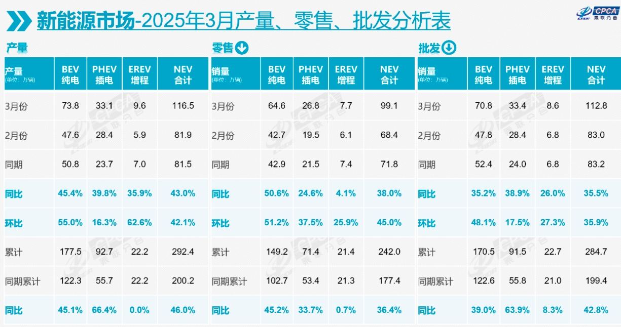 图片来源:乘联分会 乘联分会秘书长崔东树表示,由于国家双新政策的推动,“价格战”相对温和,行业内卷状态改善,今年3月的乘用车同比零售增速创近10年来新高,扭转了近10年来3月零售增速偏低的特点。“3月国内乘用车零售销量同比净增了25万辆,实现今年前3个月同比增长6%的超预期‘开门红’。”崔东树称。 3月自主品牌乘用车继续保持高增长 今年3月,国内自主品牌乘用车零售销量继续保持高增长态势,达到122万辆,同比增长31%,环比增长33%,市场份额为62.7%,同比增长7.7个百分点。1~3月,自主品牌零售市场份额63%,较去年同期增长7.9个百分点。 对于自主品牌乘用车持续保持高增长的原因,崔东树认为,这主要得益于自主品牌在新能源车市场和出口市场获得了明显增量,主流车企转型升级表现优异,如,比亚迪、吉利汽车、奇瑞汽车、长安汽车等传统车企品牌市场份额提升明显。 3月,国内主流合资品牌乘用车零售销量在同比降幅收窄至2%的同时,环比也实现了大幅正增长。乘联分会数据显示,3月,主流合资品牌乘用车零售销量为48万辆,同比下降4%,环比增长45%。其中,3月德系品牌乘用车零售份额17%,同比下降3.6个百分点;日系品牌乘用车零售份额12.2%,同比下降1.5个百分点;美系品牌乘用车市场零售份额达到6.8%,同比下降1.4个百分点。 豪华车方面,3月零售销量同比下滑幅度也较2月份进一步收窄,且相较于上个月呈现出大幅正增长。数据显示,3月,国内豪华车零售销量为25万辆,同比下降7%,环比增长68%,市场份额12.9%,同比下降3个百分点,传统豪华车市场零售份额表现较好。 受美国加征关税等外部环境影响,今年3月份我国乘用车出口出现了负增长。乘联分会数据显示,3月,我国乘用车出口(含整车与CKD)39.1万辆,同比下降8%,环比增长10%。其中,自主品牌出口达到34万辆,同比增长1%,环比增长10%;合资与豪华品牌乘用车出口4.7万辆,同比下降45%。 今年1~3月,中国汽车乘用车出口达到112万辆,同比增长1%。“美国加征关税对于东南亚等多个国家的经济、股市来说,都会是‘灾难性’影响,这将影响到中国汽车的出口增长。”崔东树在接受《每日经济新闻》记者采访时称,受地缘政策等影响,乘联分会将对2025年全年整体乘用车批发销量实现同比4%~5%增长预期进行下调,主要是为了预防全年乘用车出口量出现负增长。 不过,崔东树强调称,中国汽车出口美国占比微乎其微,尤其是自主品牌乘用车几乎没有在美国市场销售,因此中国生产的自主品牌汽车不会受到美国加征关税的影响。“本轮关税调整或会在短期内影响中国自主品牌在海外部分基地的投产建设布局,如自主品牌在墨西哥等国的投资建厂会更谨慎。”崔东树称。 新能源乘用车批发渗透率持续低于50% 燃油车信心恢复? 今年3月,国内新能源乘用车零售销量达99.1万辆,同比增长38%,环比增长45%,零售渗透率为51.1%,较去年同期提升8.7个百分点。其中,自主品牌中的新能源车渗透率为72%;豪华车中的新能源车渗透率为35%;而主流合资品牌中的新能源车渗透率仅有6%。