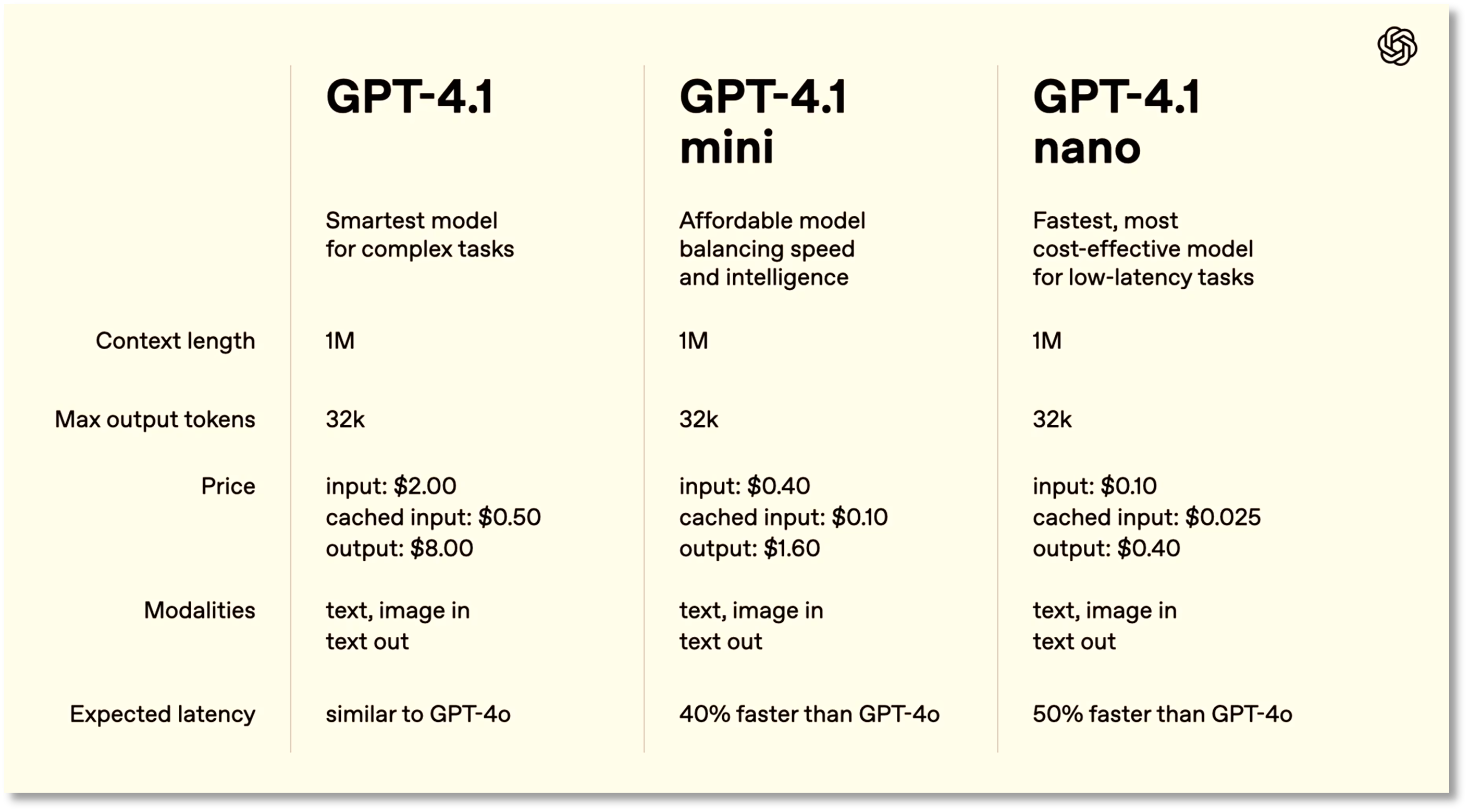 图片来源:OpenAI官网 与此同时,OpenAI宣布将在三个月后在API中淘汰GPT-4.5。究其原因,一方面是成本太高,另一方面,竞争环境,特别是开源模型的进步,也被认为是一大关键因素。 GPT-4.1系列发布,编程能力全面超越GPT-4o据OpenAI介绍,此次推出的GPT-4.1模型系列包括三个版本,分别为GPT-4.1、GPT-4.1 mini以及GPT-4.1 nano,且每个版本均针对不同的使用场景进行了优化。 GPT-4.1模型系列在各方面都优于GPT-4o和GPT-4o mini,特别是在编程和指令遵循方面,取得了重大进展。此外,GPT-4.1模型系列具有更长的上下文窗口,支持高达100万token的上下文,并且能够更为有效地提取关键信息,知识截止日期更新至2024年6月。