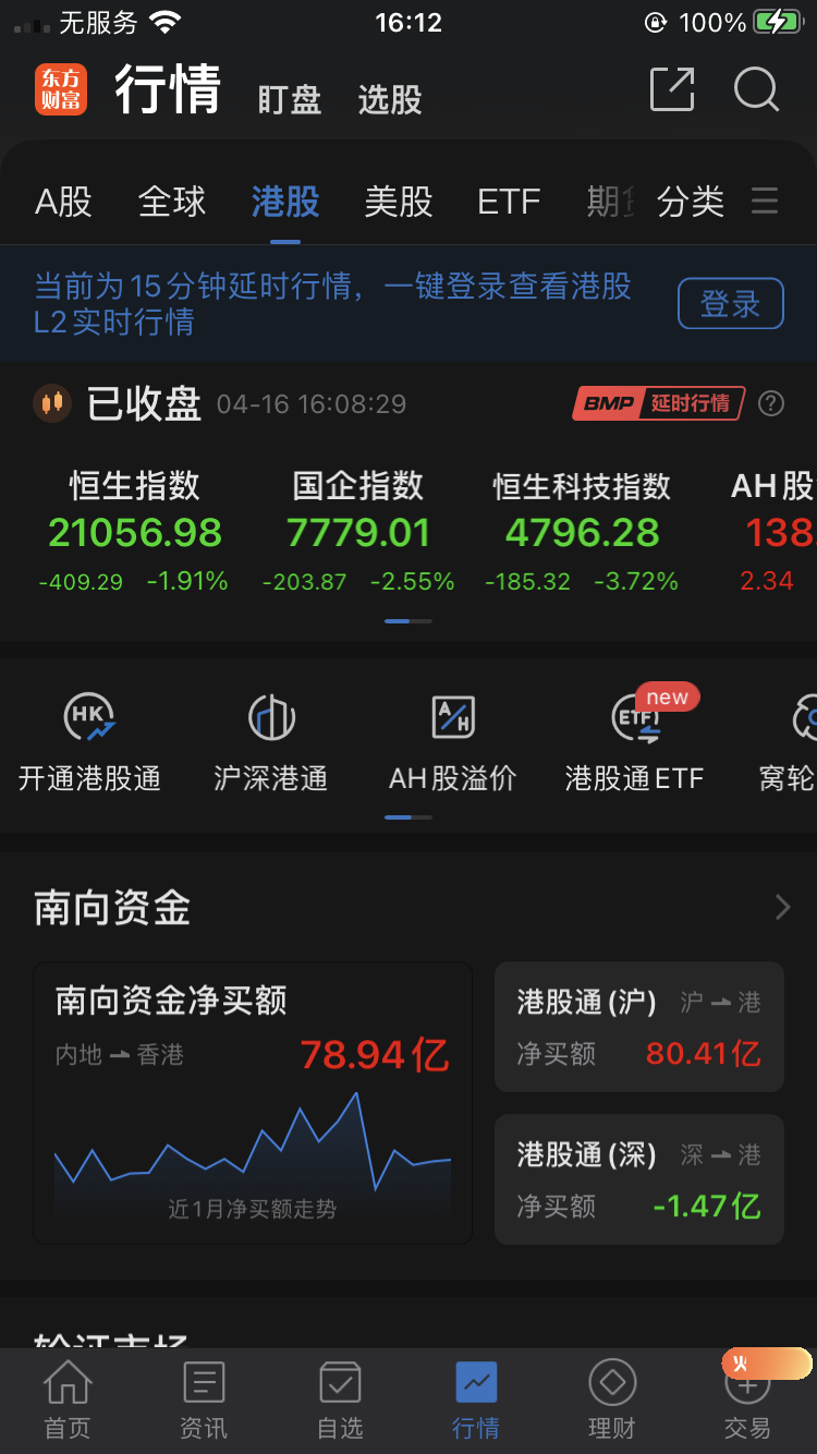 香港股市今日低开低走,截止收盘,恒生指数跌1.91%,收报21056.98点;恒生科技指数跌3.72%,收报4796.28点。南向资金今日净买入78.94亿港元。