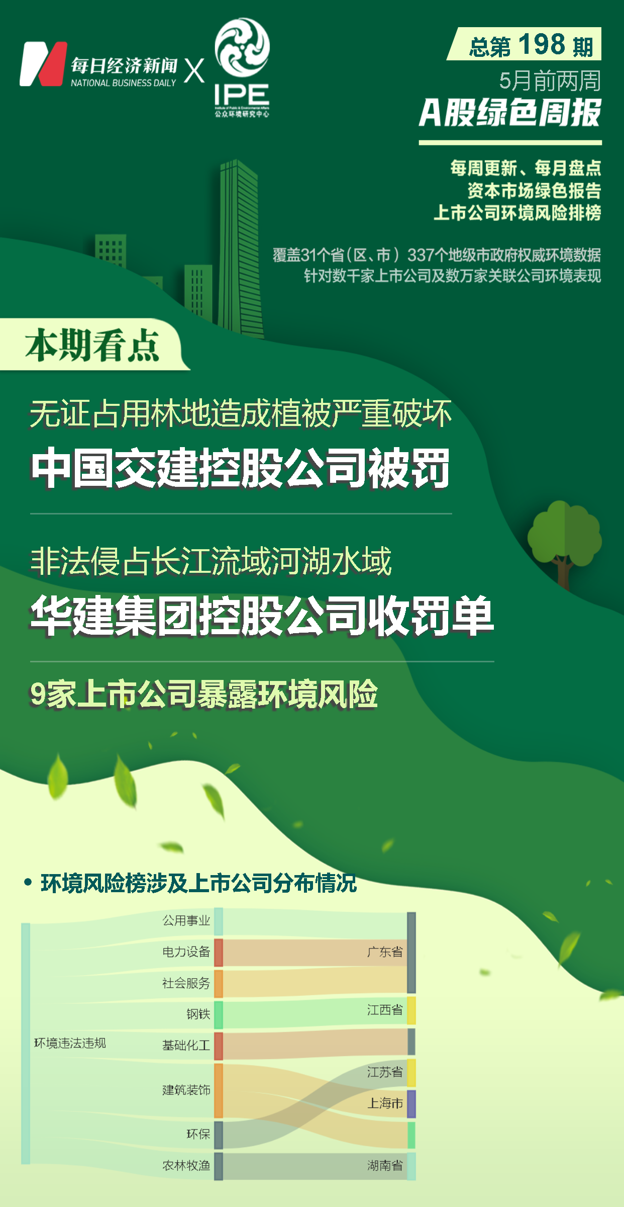 本期数据显示,生态环境领域违法违规等风险信息共关联到9家上市公司。其中,5家属于国资控制的企业。 《每日经济新闻》记者梳理发现,9家上市公司背后有58.64万户股东,投资标的登上环境风险榜,可能使他们面临投资风险。 值得注意的是,唐人神控股公司武山美神养殖有限公司(以下简称美神养殖)因未按照环评要求采取环保措施,被天水市生态环境局罚款41.4万元。 天水市生态环境局官网发布的文号为“天环(武)罚﹝2025﹞02号”的处罚书显示,沿安草滩养殖场未按照环评要求的环保措施建成3口地下水监控井。依据国务院《建设项目环境保护管理条例》第二十三条第一款,美神养殖被天水市生态环境局罚款41.4万元。 5月8日,《每日经济新闻》记者通过唐人神公开电子邮箱发去采访函。5月9日,唐人神致电记者称,该处罚项目已完成整改并通过环保验收。同时,公司将在2025年半年报中披露该处罚的详情。 此外,信用中国收录的文号为“普2508199982号”的处罚书显示,华建集团(600629.SH,股价8.21元,市值79.67亿元)控股公司上海华建工程建设咨询有限公司,于2021年11月在上海市浦东新区航头镇航都北路实施了非法侵占长江流域河湖水域的行为。2025年4月23日,依据《中华人民共和国长江保护法》第八十七条,该公司被上海市浦东新区城市管理综合行政执法局罚款18万元。 5月8日,《每日经济新闻》记者通过华建集团公开电子邮箱发去采访函。同日,记者致电华建集团,接线人员表示将去查看采访函。截至发稿,记者未获得进一步回应。 环保处罚:中国交建控股公司涉嫌无证占用林地被罚本期收录的数据显示,中国交建控股公司中交四航局第三工程有限公司(以下简称第三工程公司)因涉嫌无证占用林地,被佛冈县林业局罚款约55.75万元。 信用中国收录的文号为“佛林罚决字﹝2024﹞4号”的处罚书显示,第三工程公司在未办理《使用林地审核同意书》的情况下,为赶工期,由陈某某安排人员在龙山镇上岳村委山塘尾山场和下岳村委橘子冚山场开挖、取土,造成原有植被严重破坏。佛冈县公安局调查查明,违法单位涉嫌无证占用林地面积36.8715亩。2024年10月,深圳市爱华勘测工程有限公司再次对龙山镇下岳村委会“广连高速临时材料堆场”复绿项目进行验收,复绿标准符合《广东省被毁林地恢复植被、补种树木标准和验收办法》。 根据《中华人民共和国森林法》第七十四条第一款,按照《广东省林业局行政处罚裁量基准表》第4项、《广东省林业局行政处罚裁量权适用规则》第八条,依照《广东省林业局行政执法减免责清单<从轻处罚清单>》第1项,第三工程公司被佛冈县林业局罚款约55.75万元。 5月8日,《每日经济新闻》记者通过中国交建公开电子邮箱发去采访函。同日,记者致电中国交建,接线人员表示将去查看采访函。同时,记者致电第三工程公司,接线人员表示暂不了解详情,公司将按行政部门要求处理。截至发稿,记者未获得进一步回应。 信用中国收录的文号为“﹝2024﹞0103”的处罚书显示,方大特钢(600507.SH,股价4.36元,市值100.85亿元)控股公司本溪同成铁选有限公司,因在未经县级以上人民政府林业主管部门审核同意的情况下,于2014年—2018年陆续在林地堆放废渣占用林地,擅自改变林地用途面积6316平方米。依据《中华人民共和国森林法》第七十三条等,本溪同成铁选有限公司被本溪满族自治县林业和草原局罚款约10.11万元,并被责令限期恢复植被和林业生产条件。 5月8日,《每日经济新闻》记者通过方大特钢公开电子邮箱发去采访函。5月8日到9日,记者多次致电方大特钢,但电话均无人接听。截至发稿,记者未获得进一步回应。 近年来,随着ESG(环境、社会责任及管治)投资理念逐步升温,投资者越来越注重企业的可持续发展能力。上市公司财务投资和战略投资的环境责任也应受到重视,因此直接或间接参股企业环境数据被纳入A股绿色报告项目数据库。 需要说明的是,环境信息数据的公开均有赖于环境监管信息公开水平的不断提升。从2008年《环境信息公开办法(试行)》到新修订的《中华人民共和国环境保护法》第五章专章确立“信息公开与公众参与”的条款,信息公开从制度建设上得到了保障。 相关法律法规规定,公民、法人和其他组织依法享有获取环境信息、参与和监督环境保护的权利。各级人民政府环境保护主管部门和其他负有环境保护监督管理职责的部门,应当依法公开环境信息、完善公众参与程序,为公民、法人和其他组织参与和监督环境保护提供便利。 公众环境研究中心(IPE)及自然资源保护协会(NRDC)编写的《2018—2019年度120城市污染源监管信息公开指数(PITI)报告》也指出,环境信息以“公开为常态、不公开为例外”逐渐成为政府和社会公认的原则。 如对本项目环境数据存在疑问,或需就榜单涉及环境问题进行沟通反馈,请联系蔚蓝地图。 (实习生李嘉怡、赵伟和陈佳赫对本文亦有贡献) A股环境风险榜详细数据查询及可视化互动专题,请点击链接或扫描二维码查看。