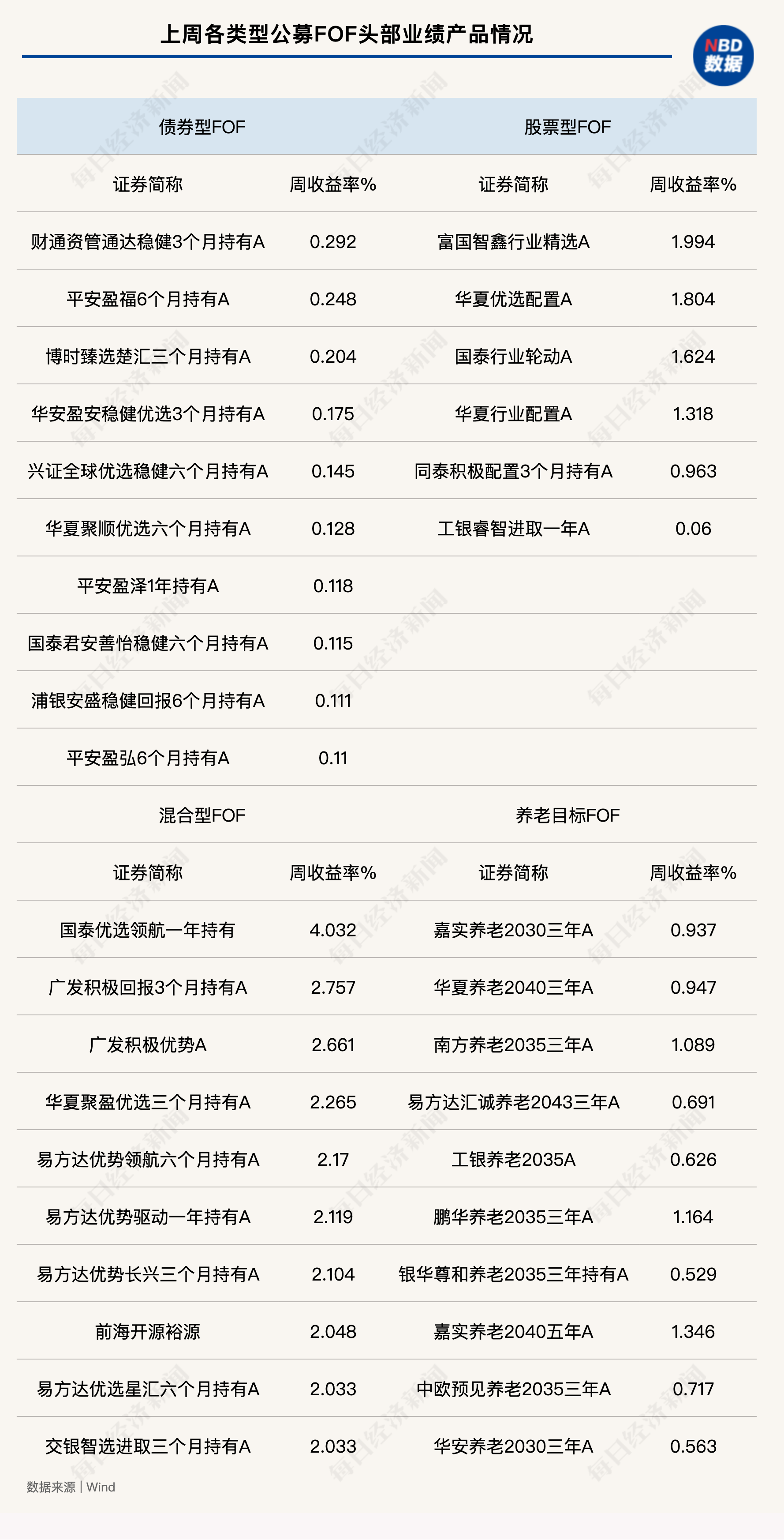 每经记者|任飞 每经编辑|肖芮冬 上周,权益市场在“五一”长假过后出现反弹,受“降息降准”事件性影响,权益类资产普遍有不错表现。事实上,一季度FOF基金就大受欢迎,全市场新发FOF基金规模环比增幅明显。而随着科技投资的不断深化,未来FOF基金的资产配置空间仍有望进一步拓展。 权益市场反弹,FOF投资胜率高上周(5月5日~5月11日),权益市场在“降息降准”消息落地的背景下,呈现出反弹走势。各主要指数均有不同程度表现,上证指数、沪深300和万得全A分别上涨1.92%、2.00%和2.32%。 受此影响,公募FOF基金整体表现较好,投资胜率较高。Wind统计显示,股票型FOF基金全部实现周内正收益,混合型FOF、养老目标型FOF的投资胜率也保持较高的水准,延续了此前市场对公募FOF的关注度。 天相投顾数据显示,今年一季度全市场新发FOF基金共计16只,其中普通FOF基金14只,养老目标FOF两只;季度内新发FOF数量较上一个季度增加10只,环比增长166.67%。全市场新发FOF基金募集规模为141.47亿元,较上一个季度增加131.69亿元,环比增长1346.12%。 这样的销售成绩其实也得益于今年以来良好的业绩表现。从近期来看,FOF基金继续延续了此前的良好势头。从上周的情况看,混合型FOF当中,国泰优选领航一年录得4.03%的周收益率,业绩领跑所有FOF基金。