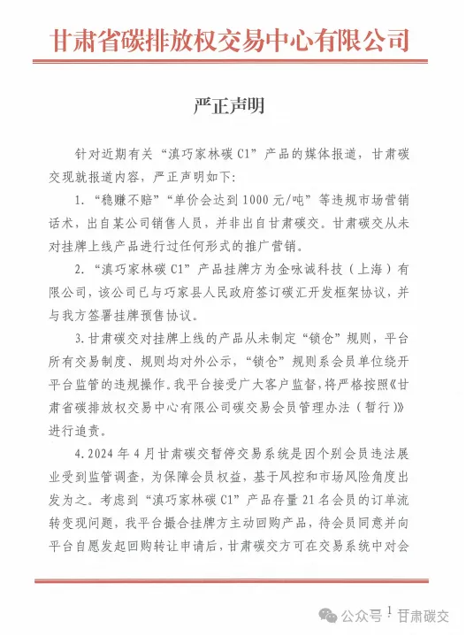 碳汇投资“锁”在系统里 甘肃碳交回应:系会员单位违规操作 在丁冬财经看资讯行情,选丁冬财经证券一站式开户交易>> 5月22日,新京报贝壳财经记者刊发了《交易中心休市一年,碳汇投资“锁”在系统里》报道,多位投资人称接到甘肃省碳排放权交易中心(以下简称“甘肃碳交”)的客服电话,要求以40元/吨的价格回购2023年至2024年4月期间卖出的“滇巧家林碳C1”,这一价格导致投资者面临亏损,部分人损失高达50%以上。投资者难以接受莫名的低价回购,交易也因此僵持了一年多时间。 对此,“甘肃碳交”5月29日发布声明,针对多数投资人被“画饼”高收益,“甘肃碳交”表示“稳赚不赔”“单价会达到1000元/吨”等违规市场营销话术,出自某公司销售人员,并非出自“甘肃碳交”。“甘肃碳交”从未对挂牌上线产品进行过任何形式的推广营销。 对于“滇巧家林碳C1”来源及真实性,“甘肃碳交”表示,“滇巧家林碳C1”产品挂牌方为金咏诚科技(上海)有限公司,该公司已与巧家县人民政府签订碳汇开发框架协议,并与“甘肃碳交”签署过挂牌预售协议。 声明称,“甘肃碳交”对挂牌上线的产品从未制定“锁仓”规则,平台所有交易制度、规则均对外公示,“锁仓”规则系会员单位绕开平台监管的违规操作。平台接受广大客户监督,将严格按照《甘肃省碳排放权交易中心有限公司碳交易会员管理办法(暂行)》进行追责。 此外,声明称,2024年4月22日“甘肃碳交”暂停交易系统是因个别会员违法展业受到监管调查,为保障会员权益,基于风控和市场风险角度出发为之。“考虑到‘滇巧家林碳C1’产品存量21名会员的订单流转变现问题,我平台撮合挂牌方主动回购产品,待会员同意并向平台自愿发起回购转让申请后,”甘肃碳交“方可在交易系统中对会员订单进行结算。” ![]() 根据新京报贝壳财经记者此前调查,五位投资人均是通过厦门范果果控股有限公司(以下简称“范果果”)以70-90元/吨的价格购买“滇巧家林碳C1”。此后,“甘肃碳交”从去年4月开始休市,宣称为“甘肃碳交”的客服要求以40元/吨回购,否则只能等待。 贝壳财经记者搜索公开信息看到,2023年12月,“甘肃碳交”与范果果在兰州举行了会员单位签约授牌仪式。 新京报贝壳财经记者陶野 (文章来源:新京报) |