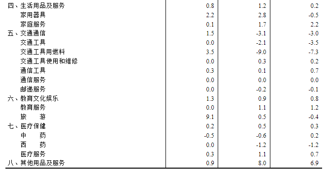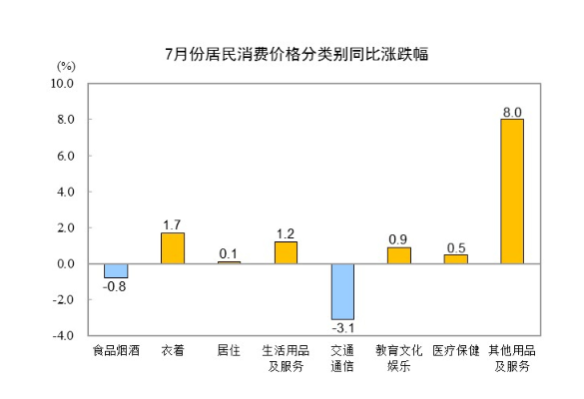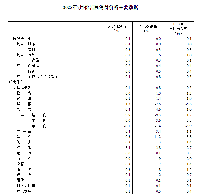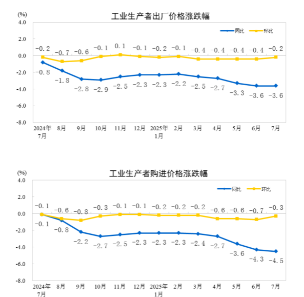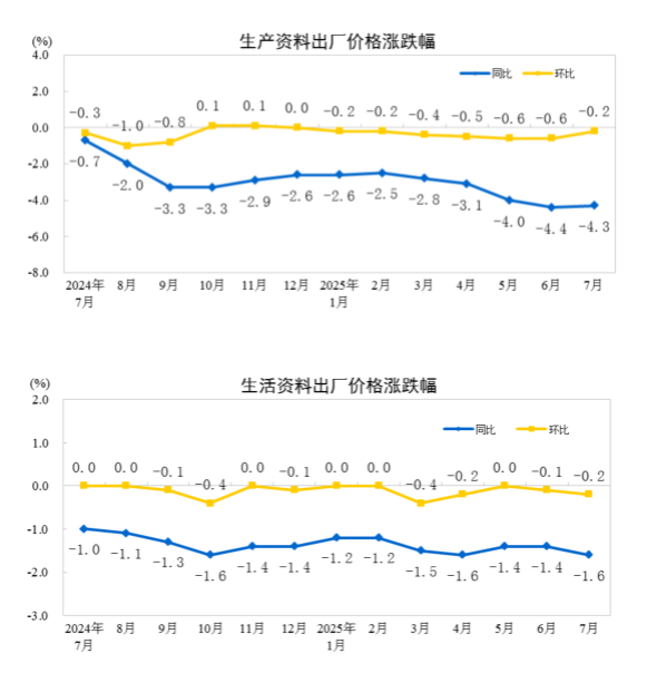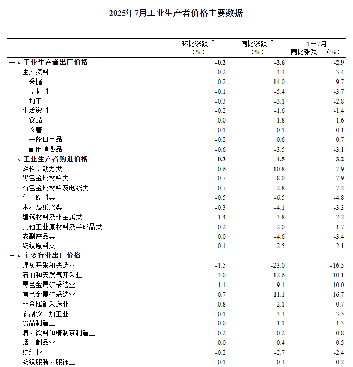 2025年7月份居民消费价格同比持平 2025年7月份,全国居民消费价格同比持平。其中,城市持平,农村下降0.3%;食品价格下降1.6%,非食品价格上涨0.3%;消费品价格下降0.4%,服务价格上涨0.5%。1--—7月平均,全国居民消费价格比上年同期下降0.1%。 7月份,全国居民消费价格环比上涨0.4%。其中,城市上涨0.4%,农村上涨0.3%;食品价格下降0.2%,非食品价格上涨0.5%;消费品价格上涨0.2%,服务价格上涨0.6%。 ![]() 一、各类商品及服务价格同比变动情况 7月份,食品烟酒类价格同比下降0.8%,影响CPI(居民消费价格指数)下降约0.21个百分点。食品中,蛋类价格下降11.2%,影响CPI下降约0.07个百分点;鲜菜价格下降7.6%,影响CPI下降约0.16个百分点;畜肉类价格下降4.6%,影响CPI下降约0.14个百分点,其中猪肉价格下降9.5%,影响CPI下降约0.13个百分点;粮食价格下降1.0%,影响CPI下降约0.02个百分点;水产品价格上涨3.4%,影响CPI上涨约0.07个百分点;鲜果价格上涨2.8%,影响CPI上涨约0.06个百分点。 其他七大类价格同比六涨一降。其中,其他用品及服务、衣着、生活用品及服务价格分别上涨8.0%、1.7%和1.2%,教育文化娱乐、医疗保健、居住价格分别上涨0.9%、0.5%和0.1%;交通通信价格下降3.1%。 ![]() 二、各类商品及服务价格环比变动情况 7月份,食品烟酒类价格环比下降0.1%,影响CPI下降约0.04个百分点。食品中,鲜果价格下降3.4%,影响CPI下降约0.07个百分点;鲜菜价格上涨1.3%,影响CPI上涨约0.03个百分点;畜肉类价格上涨0.4%,影响CPI上涨约0.01个百分点,其中猪肉价格上涨0.9%,影响CPI上涨约0.01个百分点;水产品价格上涨0.4%,影响CPI上涨约0.01个百分点。 其他七大类价格环比六涨一降。其中,交通通信、教育文化娱乐、其他用品及服务价格分别上涨1.5%、1.3%和0.9%,生活用品及服务、医疗保健、居住价格分别上涨0.8%、0.2%和0.1%;衣着价格下降0.3%。 ![]() ![]() ![]() 附注 1.指标解释 居民消费价格指数(Consumer Price Index,简称CPI)是度量居民生活消费品和服务价格水平随着时间变动的相对数,综合反映居民购买的生活消费品和服务价格水平的变动情况。 2.统计范围 居民消费价格统计调查涵盖全国城乡居民生活消费的食品烟酒、衣着、居住、生活用品及服务、交通通信、教育文化娱乐、医疗保健、其他用品及服务等8大类、268个基本分类的商品与服务价格。 3.调查方法 采用抽样调查方法抽选确定调查网点,按照“定人、定点、定时”的原则,直接派人到调查网点或从互联网采集原始价格。数据来源于全国31个省(区、市)约500个市县、10万余家价格调查点,包括商场(店)、超市、农贸(生鲜)市场、服务网点和互联网电商等。 4.数据说明 由于“四舍五入”原因,有时会出现合计数据与分类数据高值或低值相同的情况。 2025年7月份工业生产者出厂价格环比降幅收窄 2025年7月份,全国工业生产者出厂价格环比下降0.2%,工业生产者购进价格环比下降0.3%,降幅比上月分别收窄0.2个和0.4个百分点。工业生产者出厂价格同比下降3.6%,工业生产者购进价格同比下降4.5%。1—7月平均,工业生产者出厂价格比上年同期下降2.9%,工业生产者购进价格下降3.2%。 ![]() 一、工业生产者价格同比变动情况 7月份,工业生产者出厂价格中,生产资料价格下降4.3%,影响工业生产者出厂价格总水平下降约3.20个百分点。其中,采掘工业价格下降14.0%,原材料工业价格下降5.4%,加工工业价格下降3.1%。生活资料价格下降1.6%,影响工业生产者出厂价格总水平下降约0.42个百分点。其中,食品价格下降1.8%,衣着价格下降0.1%,一般日用品价格上涨0.6%,耐用消费品价格下降3.5%。 ![]() 工业生产者购进价格中,燃料动力类价格下降10.8%,黑色金属材料类价格下降8.0%,化工原料类价格下降6.5%,农副产品类价格下降4.6%,建筑材料及非金属类价格下降3.8%,纺织原料类价格下降2.5%;有色金属材料及电线类价格上涨2.8%。 二、工业生产者价格环比变动情况 7月份,工业生产者出厂价格中,生产资料价格下降0.2%,影响工业生产者出厂价格总水平下降约0.17个百分点。其中,采掘工业价格下降0.2%,原材料工业价格下降0.1%,加工工业价格下降0.3%。生活资料价格下降0.2%,影响工业生产者出厂价格总水平下降约0.06个百分点。其中,食品价格持平,衣着价格下降0.1%,一般日用品价格下降0.2%,耐用消费品价格下降0.6%。 工业生产者购进价格中,建筑材料及非金属类价格下降1.4%,黑色金属材料类价格下降0.7%,燃料动力类价格下降0.6%,化工原料类价格下降0.5%,纺织原料类价格下降0.1%;农副产品类价格持平;有色金属材料及电线类价格上涨0.7%。 ![]() ![]() 附注 1.指标解释 工业生产者价格指数包括工业生产者出厂价格指数(Producer Price Index for Industrial Products,简称PPI)和工业生产者购进价格指数。 工业生产者出厂价格指数反映工业企业产品第一次出售时的出厂价格的变化趋势和变动幅度。 工业生产者购进价格指数反映工业企业作为中间投入产品的购进价格的变化趋势和变动幅度。 2.统计范围 工业生产者出厂价格统计调查涵盖40个工业行业大类、1300多个基本分类的工业产品价格;工业生产者购进价格统计调查涵盖9大类、800多个基本分类的工业产品价格。 3.调查方法 工业生产者价格调查采取重点调查与典型调查相结合的调查方法,涉及全国4万多家工业企业。 4.统计标准 工业行业划分标准的依据是《国民经济行业分类》(GB/T4754-2017)。 5.数据说明 