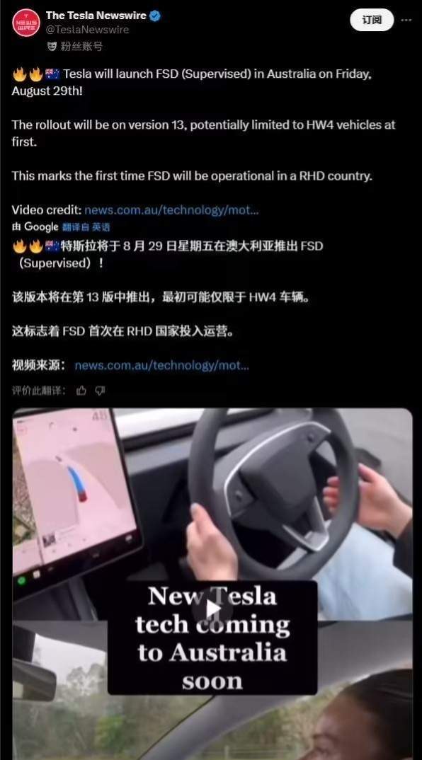 该视频由生活方式媒体《Man of Many》发布,记者本?麦金(Ben McKimm)在视频中进行了解说,视频展示了该系统对现实路况的响应速度有多快。麦金表示,对FSD的能力印象深刻,其车辆的驾驶操作与人类驾驶员十分相似。 另一段视频由记者丹妮尔?柯林(Danielle Collin)出镜,一辆特斯拉在公共道路上使用其FSD系统行驶。柯林也表示对FSD的能力印象深刻,因为车辆能够自行对停车标志等做出反应。 据The Tesla Newswire消息,特斯拉将于8月29日在澳大利亚推出FSD(监督模式)。