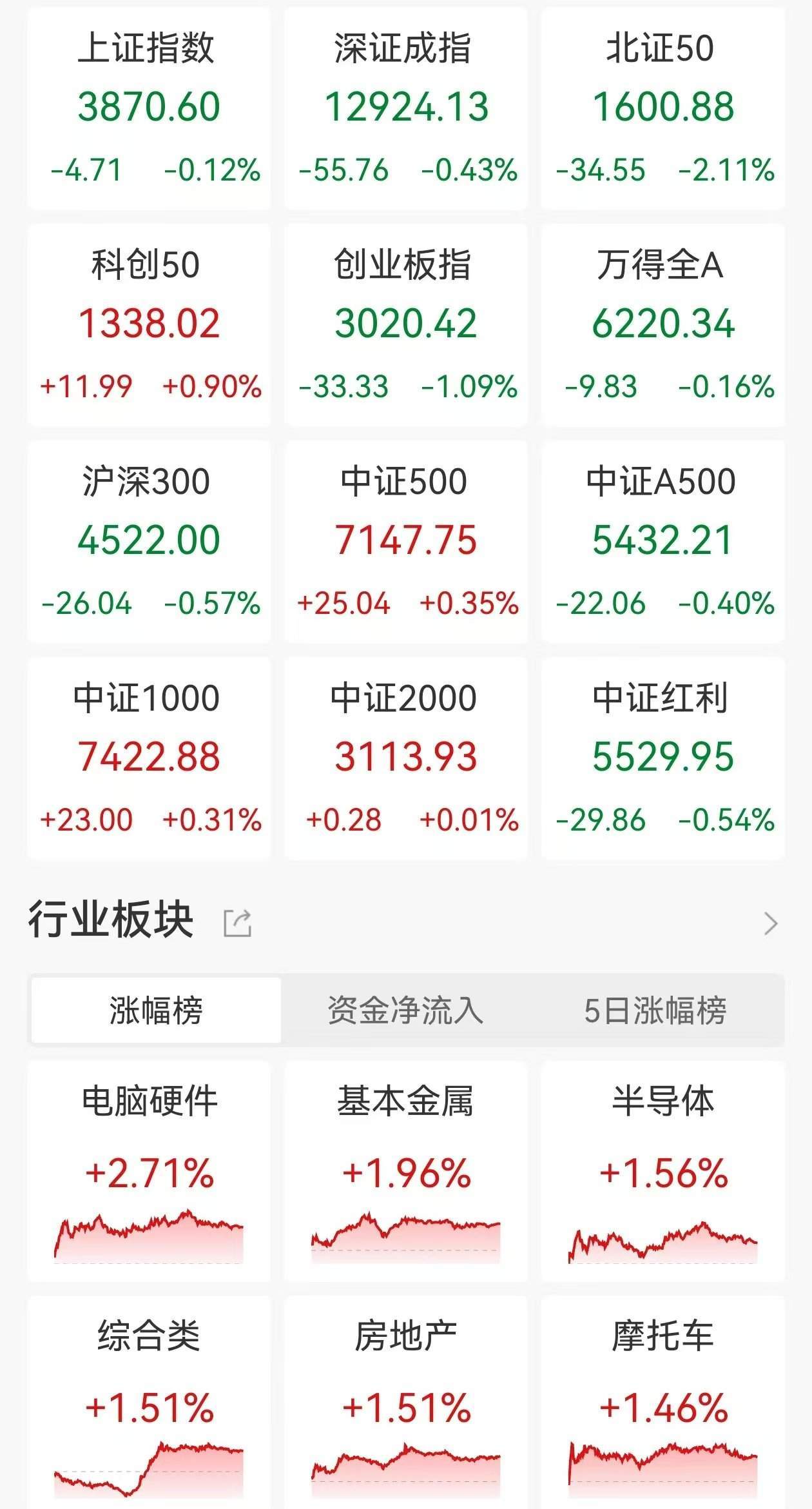 格隆汇9月12日|A股三大指数今日集体冲高回落,集体收跌;截至收盘,沪指跌0.12%报3870点盘中一度刷新十年新高,深证成指跌0.43%,创业板指跌1.09%,北证50指数跌2.11%。全天成交额2.55万亿元,较前一交易日增量837亿元。全市场近3400股下跌。