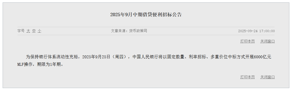 据央行网站24日消息,为保持银行体系流动性充裕,2025年9月25日(周四),中国人民银行将以固定数量、利率招标、多重价位中标方式开展6000亿元MLF操作,期限为1年期。 ![]() 央行网站截图 东方金诚首席宏观分析师王青指出,本月有3000亿MLF到期,这意味着9月央行MLF净投放达到3000亿,为连续第七个月加量续作,符合市场预期。考虑到本月央行还开展了3000亿买断式逆回购净投放,这意味着9月中期流动性净投放总额达6000亿,与上月相同,净投放规模持续处于较高水平。 王青分析,在5月降准释放长期流动性10000亿之后,近四个月中期流动性持续处于净投放状态,且近两个月净投放规模显著扩大,主要有三个原因: 一是现阶段处于政府债券持续发行高峰期,同时监管层也在引导金融机构加大信贷投放力度,央行持续注入中期流动性,体现了货币政策与财政政策之间的协调配合,有助于政府债券顺利发行,同时更好满足企业和居民的信贷融资需求。 二是受反内卷牵动市场预期,以及股市走强等因素影响,近期中长端市场利率普遍上行,银行体系流动性有所收紧。央行通过MLF等政策工具加大资金投放,有助于稳定市场预期,保持市场流动性充裕。 三是央行持续实施中期流动性净投放,也在释放数量型货币政策工具持续加力的政策信号,显示货币政策延续支持性立场。 王青认为,三季度以来,受极端天气、稳增长政策节奏、外部波动、房地产市场调整等多重因素影响,消费、投资、工业生产等宏观数据有所下行。往后看,美国高关税政策对全球贸易及我国出口的影响有可能在四季度进一步体现,加之上年同期一揽子增量政策带来高基数效应,四季度加力稳增长、稳就业的必要性上升。 综合当前经济增长动能变化,物价走势,以及更大力度推动房地产市场止跌回稳的要求,王青预计四季度数量型货币政策工具会进一步发力,央行有可能实施新一轮降准,并适时恢复国债买卖。在通过这两项政策工具向银行体系注入长期流动性的同时,四季度央行还将综合运用买断式逆回购和MLF操作,持续向市场注入中期流动性。这意味着年底前市场流动性将继续处于较为稳定的充裕状态,市场利率上行空间不大。