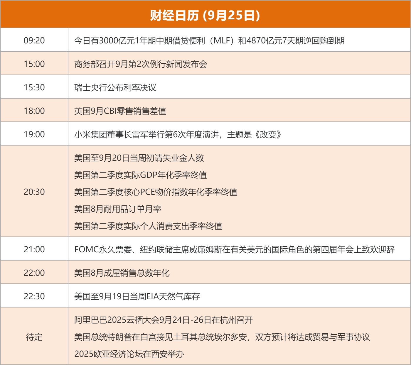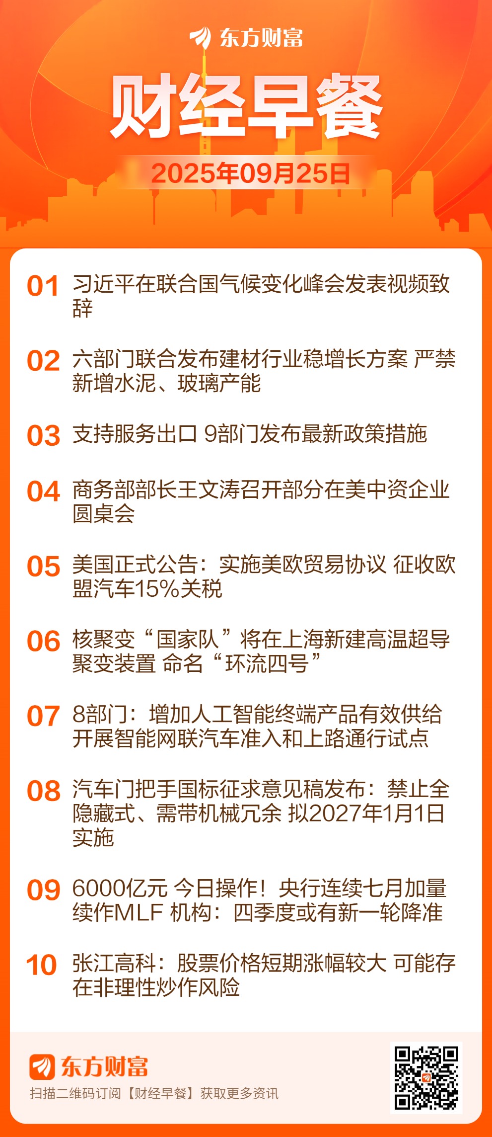 ![]() 每日精选服务出口: 商务部等9部门印发《关于促进服务出口的若干政策措施》,包含13项具体措施,旨在推动服务贸易高质量发展。政策措施包括用好用足中央和地方现有资金渠道支持服务出口,增强服务贸易创新发展引导基金撬动作用,优化服务出口零税率申报程序,加大出口信用保险支持力度等。 其中提到,支持在上海自贸试验区临港新片区、海南自由贸易港等有条件的地区开展国际数据服务业务。适应服务贸易新业态新模式发展需要,支持在自贸试验区、海南自由贸易港、国家服务业扩大开放综合试点示范地区等建立国际数据中心和云计算中心,面向各类有需求的企业提供数据处理服务。 数字消费: 近日,商务部等8部门联合印发《关于大力发展数字消费共创数字时代美好生活的指导意见》。《指导意见》全面贯彻落实党中央、国务院决策部署,发挥超大规模市场优势,扩大数字消费多元化供给,创新和丰富数字消费场景,促进数字消费更高水平供需动态平衡,激发和增强社会经济活力,共创数字时代美好生活。 其中提到,扩大数字产品消费。鼓励企业加速研发创新,增加人工智能终端产品有效供给,释放人工智能手机、电脑、智能机器人、可穿戴设备、桌面级3D打印设备等新产品消费潜力。加快智能家电、智能安防、视频照护系统等研发及互联互通。开展智能网联汽车准入和上路通行试点。培育建设新消费品牌,推动数字国潮等品牌创新发展。 中美经贸: 商务部部长王文涛9月23日在美国纽约召开部分在美中资企业圆桌会。王文涛指出,商务部高度重视中资企业在美发展,将按照中央决策部署,努力稳定中美经贸合作,坚定维护中国企业正当权益,为两国企业互利合作营造良好环境。 建材行业稳增长: 工业和信息化部等六部门印发《建材行业稳增长工作方案(2025—2026年)》,严格水泥玻璃产能调控,严禁新增水泥熟料、平板玻璃产能。方案要求新建改建项目须制定产能置换方案,严禁向大气污染防治重点区域转移水泥熟料、平板玻璃产能。 央行操作: 为保持银行体系流动性充裕,2025年9月25日(周四),中国人民银行将以固定数量、利率招标、多重价位中标方式开展6000亿元MLF操作,期限为1年期。中期借贷便利(MLF)连续7个月加量续作。 9.24行情一周年: 自去年“9.24”以来,市场行情已历经1整年。期间,A股市值合计增长35万亿元,并突破105万亿大关,百元股数量大增347%,而5元以下低价股数量“腰斩”,ETF资产净值规模也有近9成增长。个股方面,剔除新股,其平均上涨86.2%,中位数涨幅60.6%,其中,1504股涨幅超100%,占市场近28%比例。ETF市场中,科创芯片相关ETF表现突出,以接近2倍的区间涨幅成为领跑品种。 核聚变: 正在上海举行的第二十五届中国国际工业博览会上,注册资本150亿元、正式挂牌成立仅两个多月的中国聚变能源有限公司(下称中国聚变公司)首次公开亮相,展示其技术路线及业务布局。据媒体报道,中国聚变公司将在上海新建一个聚变实验装置,用以验证其在上海研制的高温超导磁体,该装置暂命名为“中国环流四号(HL-4)”。 隐藏式门把手: 9月24日,工业和信息化部装备工业一司对《汽车车门把手安全技术要求》强制性国家标准及三项强制性国家标准修改单公开征求意见。在该“安全技术要求”中,明确了每个车门(不包括尾门)应配置具备机械释放功能的车外门把手。而据第三方统计数据显示,今年4月中国汽车市场销量排名前100名的新能源车型中,隐藏式门把手的搭载率约为60%。 热点题材阿里云: 在2025阿里云栖大会上,阿里云宣布新一轮全球基础设施扩建计划:将在巴西、法国和荷兰首次设立云计算地域节点(region),并将扩建墨西哥、日本、韩国、马来西亚和迪拜的数据中心,以便更好服务全球客户日益增长的AI和云计算需求。 先进封装: 2025先进封装及高算力热管理大会将于9月25-26日在苏州开幕。机构指出,在摩尔定律放缓和我国先进制程技术受限的现状下,先进封装成为国产算力芯片突破性能瓶颈的重要方向。 游戏: 24日晚间,国家新闻出版署公布2025年9月份游戏审批信息,145款国产游戏、11款进口游戏,共计156款游戏获批,是年内第三次单月版号发放数量超过150个。腾讯、网易、米哈游等多家头部公司重点新游在列。 AI智能体: 据媒体报道,阿里巴巴心流研究团队正式发布全新终端AI智能体iFlow CLI,面向个人用户永久免费开放。用户可通过自然语言命令在终端上直接执行任务,从而实现从文件整理到复杂工作流程的全面自动化。据预测,AI Agent市场正在快速扩张,规模从2023年的37亿美元增长至2025年的73.8亿美元,预计到2032年将超过1000亿美元。 低空经济: 近日,沙特阿拉伯的自动化智能科技企业FrontEnd、机场运营商Cluster2Airports与中国空中交通科技企业亿航智能(Ehang)签订谅解备忘录,计划将在沙特全国范围内推出自动驾驶飞行器(AAVs)和空中出租车服务,用于客运和物流。基于该备忘录,自动驾驶飞行器和空中出租车将在沙特从试点示范迈入全面运营阶段。 激光雷达: 机器人视觉需求井喷,点燃激光雷达“机载”新爆点。据媒体报道,机器人产业爆发性扩张,服务机器人产量增长明显,智能割草机、无人配送、人形机器人等新场景加速落地,直接拉动激光雷达作为核心感知部件的需求。有业内人士乐观预测,未来的三四年机器人应用或成为继车载辅助驾驶后最