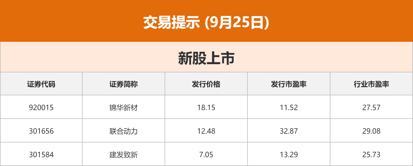 公司新闻上纬新材:上海智元恒岳科技合伙企业计划要约收购公司股份数量为1.49亿股,占公司总股本的37.00%,要约收购价格为7.78元/股,预计所需最高资金总额为11.61亿元。本次要约收购期限为2025年9月29日至2025年10月28日。 恒瑞医药:公司具有自主知识产权的1类创新药瑞康曲妥珠单抗(SHR-A1811)项目有偿许可给Glenmark Specialty,获得1800万美元首付款,并有资格获得最高可达10.93亿美元的里程碑付款及销售提成。 张江高科:公司近期主营业务无重大变化,主营业务为张江科学城的产业空间载体建设运营以及主导产业投资。公司基本面没有重大变化,不存在应披露未披露的重大信息。 华软科技:关于光刻胶基材业务,公司现有光引发剂产品,按客户订单小批量生产销售,2024年该产品收入占公司总营收约不到2%,连续两年对公司的经营业绩影响较小,未来销售情况受多种因素影响存在较大不确定性。 华天科技:公司正在筹划发行股份及支付现金购买资产并募集配套资金暨关联交易事项。公司证券自2025年9月25日开市时起开始停牌,预计在不超过10个交易日内披露本次交易方案。本次交易的标的公司为华羿微电子股份有限公司,为公司控股股东的控股子公司。华羿微电子股份有限公司的经营范围包括半导体功率器件的研发、生产、销售等。 大龙地产:公司控股子公司大龙有限与城发公司达成初步意向,拟收购其持有的北京城竺房地产开发有限公司60%股权。本次交易方案尚未最终确定,目前不能确定是否构成关联交易,预计不构成重大资产重组。 盛科通信:2025年1月14日至2025年9月24日期间,国家集成电路产业投资基金股份有限公司通过集中竞价方式和大宗交易方式合计减持公司股份1885.69万股,占公司总股本的比例由19.60%减少至15.00%。 长盈精密:今年年初到8月底,公司累计交付了人形机器人结构件产品的价值已经超过了8000万元。目前公司在人形机器人业务上供应给客户的料号超过400个。公司的项目集中在灵巧手上的传动件,现在逐步增加至大尺寸的传动件。 东方材料:公司收到中国证监会安徽监管局的行政监管措施决定书,指出公司存在会计基础工作不规范、内部控制不完善等问题,被责令在30日内完成整改并提交书面整改报告。 湖南黄金:公司收到子公司新龙矿业通知,新龙矿业本部将于9月25日起逐步恢复生产。新龙矿业本部于8月24日停产。经公司资产财务部初步测算,新龙矿业本部此次停产预计减少公司当期净利润约5200万元。 恩捷股份:公司目前硫化锂的中试产线已经搭建完成,正在产能爬坡中,目前硫化锂以自供为主,同时也在送样下游客户,小批量出货。公司会密切关注行业技术发展和动态,稳步推进公司全固态电池材料的拓展。 >">>">点击查看更多上市公司重大公告>> 环球市场 交易提示![]() 点击立即参与申购>> 债市纵览Shibor:9月24日,隔夜shibor报1.4340%,上涨2.10个基点;7天shibor报1.5900%,上涨12.80个基点;14天shibor报1.6560%,上涨8.90个基点;1月shibor报1.5560%,上涨0.50个基点;3月shibor报1.5660%,上涨0.40个基点。 欧债:周三(9月24日)欧市尾盘,德国10年期国债收益率下跌0.1个基点,报2.748%,两年期德债收益率大致持平,报2.022%,日内交投于2.014%-2.026%区间;30年期德债收益率跌0.5个基点,报3.338%。2/10年期德债收益率利差跌0.089个基点,报+72.394个基点。法国10年期国债收益率涨0.4个基点,报3.568%;30年期法债收益率涨0.2个基点。意大利10年期国债收益率涨2.2个基点,报3.565%。西班牙10年期国债收益率涨0.4个基点,希腊10年期国债收益率涨1.6个基点。 美债:周三(9月24日)纽约尾盘,美国10年期国债收益率涨3.85个基点,报4.1447%,日内交投区间为4.0965%-4.1505%,北京时间16:11刷新日低,18:00开始持续震荡上行。两年期美债收益率涨1.40个基点,报3.6%,日内交投于3.5571%-3.6021%区间。2/10年期美债收益率利差涨2.266个基点,报+54.064个基点。 商品期货国内期货:9月24日,国内商品期货收盘,多数上涨。玻璃涨超4%,燃料油涨逾3%,集运欧线、多晶硅等涨超2%,原油、PTA等涨超1%,锰硅、甲醇等小幅上涨;菜粕跌约3%,菜籽油跌逾1%,烧碱、豆油等小幅下跌。 国际黄金:COMEX黄金期货当月连续合约下跌47.60美元,跌幅1.25%,报3768.1美元/盎司。 国际原油:截至当天收盘,纽约商品交易所WTI原油期货当月连续合约结算价上涨1.58美元,收于每桶64.99美元,涨幅为2.49%;伦敦布伦特原油期货当月连续合约上涨1.49美元,收于每桶68.46美元,涨幅为2.22%。 国际金属:LME期铜收涨362美元,报10336美元/吨。LME期铝收涨14美元,报2652美元/吨。LME期锌收涨50美元,报2938美元/吨。LME期铅收跌2美元,报2000美元/吨。LME期镍收涨63美元,报15417美元/吨。LME期锡收涨19美元,报34321美元/吨。LME期钴收平,报34550美元/吨。 国际农产品:周三(9月24日)纽约尾盘,彭博谷物分类指数跌0.40%,报28.9836点。CBOT玉米期货跌0.53%,CBOT小麦期货跌0.19%。CBOT大豆期货跌0.35%,报10.0850美元/蒲式耳,北京时间20:00开启一波拉升行情,20:40刷新日高至10.20美元上方,美股开盘后回吐涨幅;豆粕期货跌0.50%,豆油期货跌0.22%。 外汇市场人民币:9月24日,在岸人民币北京时间16:30收报7.12190,较上一交易日下跌86点。离岸人民币北京时间18:00报7.12803,较上一交易日下跌152.2点。在岸/离岸人民币北京时间18:00价差为-54.3。 人民币外汇掉期:9月24日,截至北京时间16:30,美元兑人民币6个月掉期报-715点,美元兑人民币1年掉期报-1366点。 美元:美