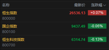 美股周三表现向下,投资者仍消化联储局主席鲍威尔对美股估值偏高言论,加上市场关注地缘政局消息,拖累大市气氛,三大指数均录得跌幅收市。美元走势回升,美国十年期债息亦回升至4.14厘水平,金价高位反复,油价表现则向上。 今日港股三大指数涨跌不一,恒生指数涨0.07%,报26536.13点,恒生科指跌0.13%,国企指数跌0.06%。盘面上,科网股涨跌不一,京东涨超1%,网易、联想、快手跌超1%;创新药概念回暖,乐普生物涨超3%;有色金属板块普涨,洛阳钼业(603993)涨超8%;中资券商股活跃,中信证券(600030)涨超1%;汽车股分化,奇瑞汽车上市首日涨超11%;半导体板块延续涨势,脑洞科技涨超4%。