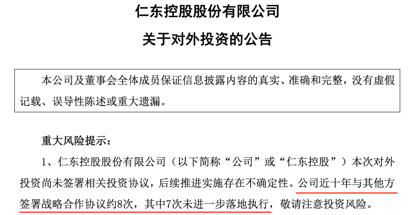 8次合作协议,7次未落地 *ST仁东在风险提示中表示,江原科技尚处于初创投资阶段,未来的经营发展存在不确定性,且公司缺乏初创企业投资经验,投资可能面临重大风险。 公告显示,江原科技2025年半年度营业收入1230.55万元、归母净利润-6853.69万元,尚未实现盈利。 江原科技前轮次投资(含追加投资)投前估值为15亿元,2025年1月投后估值18.6亿元,*ST仁东本轮次投前估值较前轮次投后估值增长12.90%。 *ST仁东表示,本次投资属于高估值投资,投资回收期长,标的公司运营发展过程中可能受宏观经济、产业政策、行业周期及标的公司自身的经营管理等多种因素影响,存在不能实现预期效益甚至投资失败及减值亏损等重大风险。 而且,此次投资为跨界投资。目前江原科技与*ST仁东主业尚无具体协同,其未来能否与公司主业实现完全协同发展,存在重大不确定性。 *ST仁东还提到,公司本次对外投资尚未签署相关投资协议,后续推进实施存在不确定性。*ST仁东称,公司近10年与其他方签署战略合作协议约8次,其中7次未进一步落地执行。 ![]() 证券时报记者查询发现,近年来,*ST仁东的确先后多次发布签署战略合作协议的公告。具体合作对象包括中信银行信用卡中心、江西银行、京东集团、兴业银行北京分行等。 2017年1月,*ST仁东披露与深圳市京基百纳商业管理有限公司签署了战略合作框架意向协议,双方拟在支付及行业定制、综合金融服务、智能停车服务等多个领域开展合作,后续该协议过期。 2017年6月,*ST仁东发布与江西银行签署战略合作协议的公告,江西银行在有效期内为公司及控股子公司提供20亿元综合授信额度,而后续双方尚未展开实质性合作。 (文章来源:证券时报网) |