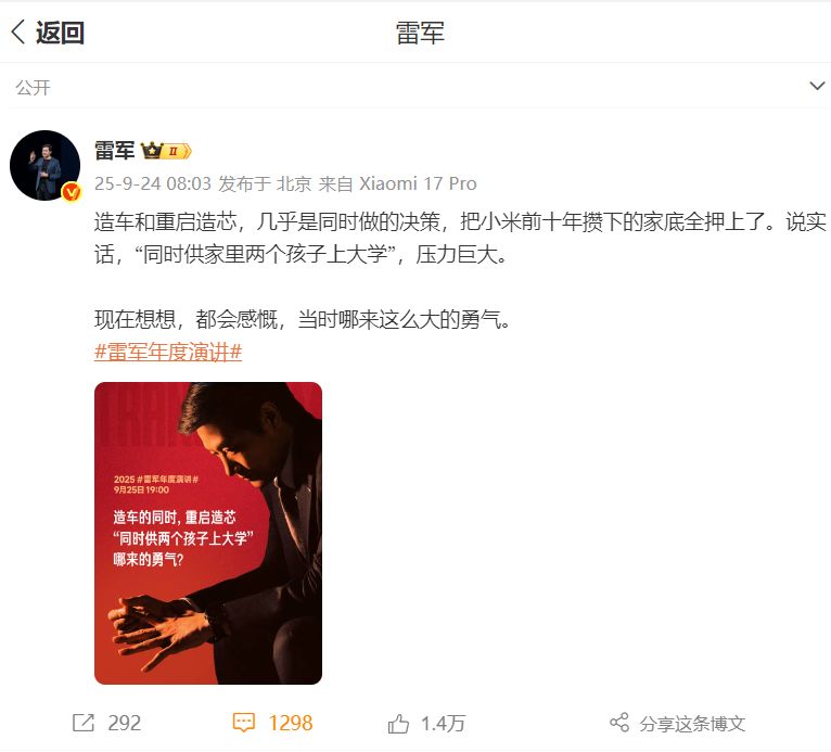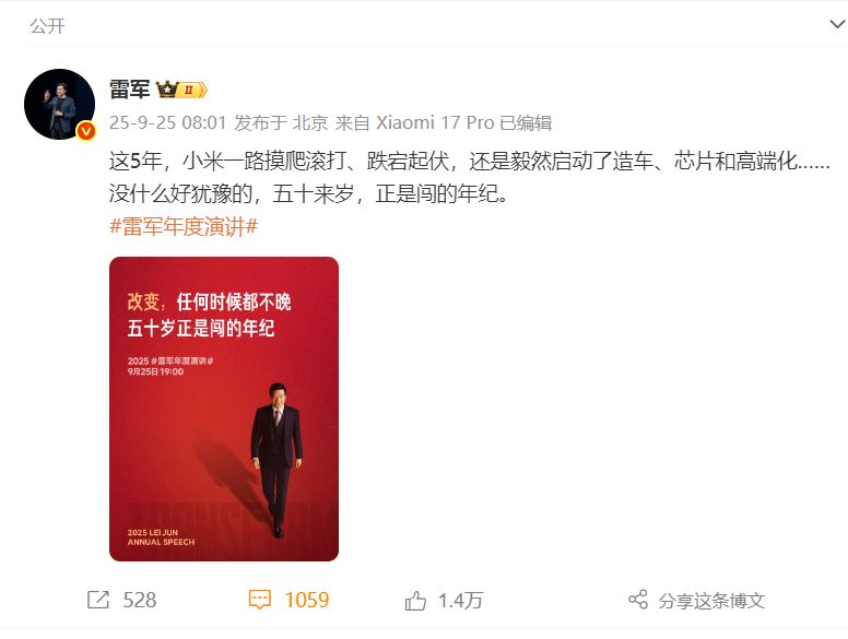 雷军最新发声:五十来岁 正是闯的年纪!小米17系列今晚发布 全球首发第五代骁龙8至尊版处理器