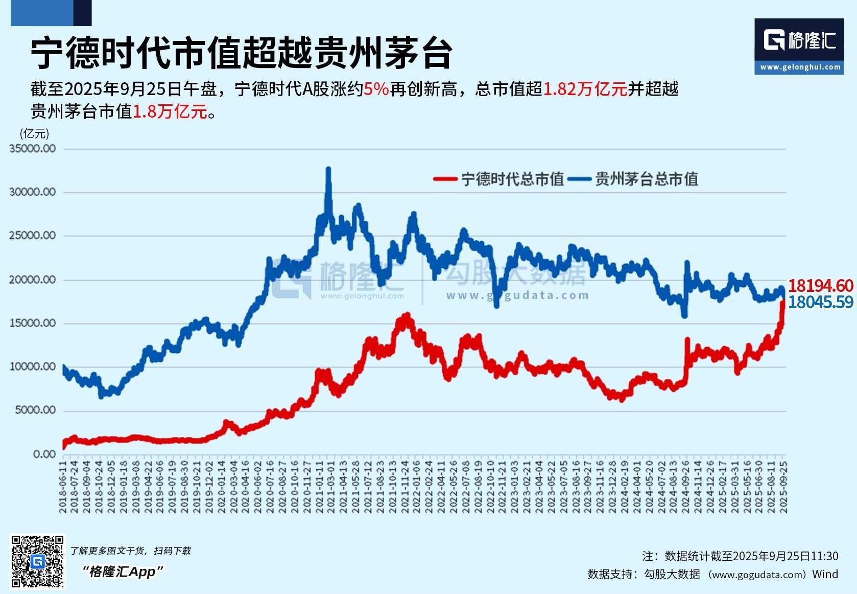 格隆汇9月25日|宁德时代(300750)A股涨超5%报402.59元(年内累涨54%),H股涨5%报531.5港元,均创历史新高,总市值突破1.84万亿元,超越贵州茅台(600519)的1.80万亿元,升至A股第五位。这或许标志着资本市场一个时代的结束,另一个新时代的开始。