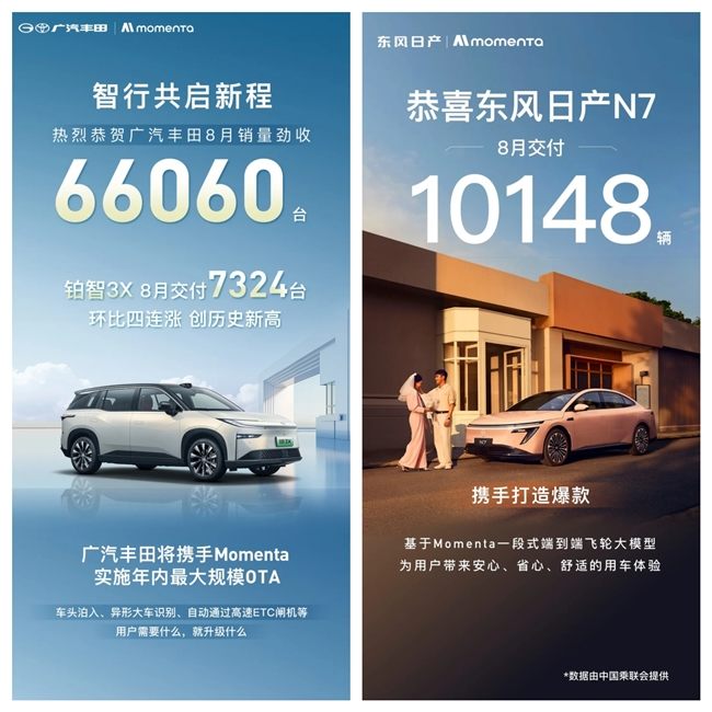 Momenta CEO 曹旭东(图源:Momenta) 在复杂的交通环境下,地图数据的及时性和完整性一直是智能驾驶面临的挑战。Momenta采用“无图端到端”方案,即不依赖高精地图,可在全世界的城市道路、高速公路、泊车等场景快速部署,真正做到了“有图无图都能开”,成为中国首家使用同一套技术方案落地全球的智能驾驶公司。 量产实践:规模化应用彰显实力 在探究智能驾驶公司实现规模化落地时,Momenta的量产成果令人印象深刻。基于30亿公里驾驶数据提炼的7000万组高价值场景数据,涵盖大量复杂长尾难题,为模型训练提供坚实基础。其量产搭载速度呈现跨越式增长:首个10万辆用时两年,第二个10万辆仅用半年,第三个10万辆不到三个月。截至目前,Momenta智能辅助驾驶系统量产规模已超40万辆,展现出强大的工程化能力。 这种技术优势已转化为实实在在的市场规模优势。从成功交付量产车型数量来看,Momenta从2022年的1款,到2023年的8款,再到2024年的26款,实现快速跃升。目前,Momenta累计合作量产车型已超160款,覆盖多家主流车企。广汽丰田铂智3X、东风日产N7等合作车型市场表现亮眼,其中铂智3X上市1小时大定订单破万,八月交付7324台,环比四连涨,创历史新高;N7八月交付量首次突破万台,达到10148台,环比增长57%。