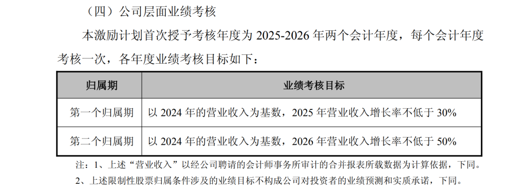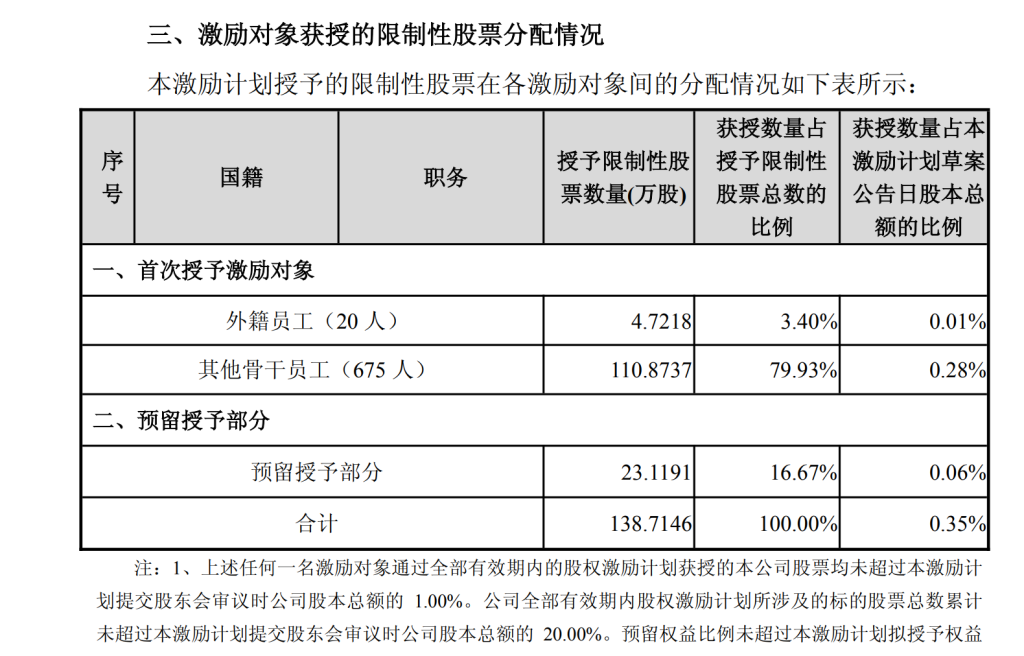 影石创新发布上市后首份股票激励计划。 9月24日晚间,影石创新(688775.SH)发布2025年限制性股票激励计划(草案)。激励计划拟向激励对象授予第二类限制性股票合计138.7146万股,约占本激励计划草案公告时公司股本总额的0.35%。 其中,首次授予115.5955万股,约占本激励计划草案公告日公司股本总额的0.29%,首次授予部分约占本次授予权益总额的83.33%;预留授予23.1191万股,约占本激励计划草案公告日公司股本总额的0.06%,预留授予部分约占本次授予权益总额的16.67%。 此激励计划采取的激励工具为限制性股票(第二类限制性股票)。股票来源为影石创新向激励对象定向发行或/和从二级市场回购的公司A股普通股股票。公告指出,影石创新所处的全景相机行业属于技术密集型行业,人才是公司长期稳定发展的根基,公司历来重视人才培养和储备,促进员工与企业共同成长,而行业人才稀缺,人才竞争加剧,为保持公司市场竞争力和对核心人才的吸引力,公司特此推出股权激励计划。 本计划限制性股票的首次及预留授予价格为148.92元/股,即满足授予条件和归属条件后,激励对象可以每股148.92元的价格购买公司A股普通股股票。截至9月24日收盘,影石创新报300.31元/股,跌0.66%。股权激励授予价格为148.92元/股,较24日收盘价折价50.41%。 公告指出,激励计划首次拟授予激励对象共计695人,包括公司(含分公司及控股子公司)骨干员工,首次授予激励对象不包括公司董事、高级管理人员、单独或合计持有公司5%以上股份的股东或实际控制人及其配偶、父母、子女。占公司员工总人数(截至2025年6月30日公司员工总人数为3235人)的21.48%。 以上激励对象含有20名外籍员工,公告指出,纳入激励对象的外籍员工是在对应岗位的关键人员,在公司的日常管理、技术、业务、经营等方面起到不可忽视的重要作用,股权激励的实施能激励和吸引外籍高端人才的加入,有助于公司的长远发展。 ![]() 此次激励计划考核期间为2025-2026年两个会计年度,每个会计年度考核一次。 公司层面业绩考核方面,第一个归属期以2024年的营业收入为基数,2025年营业收入增长率不低于30%;第二个归属期以2024年的营业收入为基数,2026年营业收入增长率不低于50%。 以2024年的营收55.74亿元为基数计算,影石创新2025年的业绩考核目标超过72.46亿元;2026年的业绩考核目标超过83.61亿元。 ![]() 若激励计划预留授予部分限制性股票在2025年第三季度报告披露前授出,则预留授予部分的业绩考核目标与首次授予部分一致。若在2025年第三季度报告披露后授出,则预留授予部分限制性股票各归属期的业绩考核目标为:第一个归属期以2024年的营业收入为基数,2026年营业收入增长率不低于50%;第二个归属期以2024年的营业收入为基数,2027年营业收入增长率不低于65%。 ![]() 若公司未满足上述业绩考核要求,则所有激励对象对应考核当年计划归属的限制性股票全部取消归属,并作废失效。 个人层面绩效考核要求方面,激励对象的绩效考核结果划分为合格、不合格两个档次。若公司层面业绩考核目标达成,激励对象当年实际归属的限制性股票数量=个人当年计划归属限制性股票数量×个人层面归属比例。激励对象当期计划归属的限制性股票因考核原因不能归属的,作废失效,不可递延至下一年度。 ![]() 最近处于风口浪尖的创业公司“影石创新”于今年6月11日登陆科创板,这也是其上市后首次发布的限制性股票激励计划。 此前,影石创新曾陷入“撒钱”风波。8月15日,一段影石创新创始人给员工撒钱的视频在网络上流传。8月15日晚间,影石创新发布《关于相关媒体报道的说明公告》称,2025年8月14日21时,影石创新全景无人机品牌“影翎Antigravity”宣布产品开启公测,并发布相应宣传视频。该全景无人机产品计划于2026年1月正式发售,目前并未产生实际收入,预计不会对2025年度的经营业绩产生重大影响,“当晚,该无人机项目团队的百余名员工(以研发人员为主)在公司深圳办公室内举行小规模团建活动。活动过程中,公司董事长以个人薪金通过现金红包派发的方式参与互动。” 8月28日,影石创新(688775.SH)发布2025年半年度报告。财报显示,公司上半年营业总收入36.71亿元,同比增长51.17%;归属于上市公司股东的净利润5.2亿元,同比微增0.25%。 财报解释称,短期利润增速放缓主要源于公司主动加大战略性投入,特别是在创新领域的研发和市场布局。营收增长主要来自新产品的推出和全球市场的开拓。影石在报告期内推出全景相机X5、AcePro2街拍套装及GOUltra等新品。