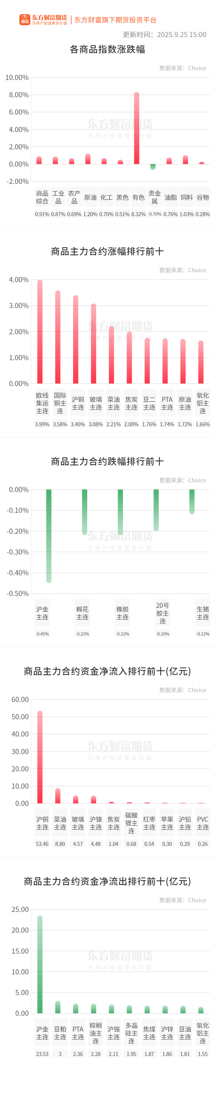 行情纵览![]() 宏观产经新华社:9月25日,2025年全国国庆文化和旅游消费月主场活动在四川省成都市举办,正式启动国庆文旅消费月,于9月下旬至10月下旬开展系列文旅消费活动,激发假日消费活力,满足人民美好生活需要。 每日经济新闻:当地时间9月24日,美国特朗普政府发布正式公告,实施美国与欧盟达成的贸易协议,确认自8月1日起,对欧盟进口汽车及汽车产品征收15%的关税。此外,文件还列出了对某些药物化合物、飞机零部件及其他进口商品的关税豁免。 财联社:央行今日开展4835亿元7天逆回购操作,投标量4835亿元,中标量4835亿元,操作利率为1.40%,与此前持平。 品种资讯黑色系期货 钢材:据Mysteel,截至9月25日当周,螺纹钢产量由降转增,厂库连续三周下降,表需连续二周增加,社库连续二周下降。螺纹产量206.46万吨,较上周增加0.01万吨;螺纹厂库164.41万吨,较上周减少0.66万吨,降幅0.4%;螺纹社库471.89万吨,较上周减少13.32万吨,降幅2.75%;螺纹表需220.44万吨,较上周增加10.41万吨,增幅4.96%。(我的钢铁网) 焦煤:9月25日蒙古国ETT公司炼焦煤进行线上竞拍,1/3焦精煤A12,V37,S0.85,G80,Mt10起拍价90.4美元/吨,挂牌数量3.2万吨全部成交,成交价格100.4美元/吨,较昨日上涨2.5美元/吨,以上价格均不含税。供货地点为甘其毛都口岸海关监管区,供货时间为付款后45天内,最后供应日期为2025年11月9日。(我的钢铁网) 焦炭:邢台市场焦炭价格计划提涨,捣固湿熄焦上调50元/吨、捣固干熄焦上调55元/吨。调整后捣固准一干熄报价1565元/吨,出厂价现金含税,自9月26日0时起执行。(我的钢铁网) 农产品期货 生猪:据农业农村部监测,9月25日“农产品批发价格200指数”为118.78,与昨天持平,“菜篮子”产品批发价格指数为119.70,与昨天持平。截至今日14:00时,全国农产品批发市场猪肉平均价格为19.44元/公斤,比昨天下降0.8%;鸡蛋8.48元/公斤,比昨天下降0.1%。(农业农村部) 棕榈油:马来西亚独立检验机构Amspec表示,马来西亚9月1-25日的棕榈油出口量为1185422吨,上月同期为1065005吨,环比增加11.3%。(新华财经) 有色/贵金属期货 沪铜:9月25日国内市场电解铜现货库存14.56万吨,较18日降1.10万吨,较22日降0.28万吨; 上海库存9.86万吨,较18日降0.11万吨,较22日增0.39万吨; 广东库存1.54万吨,较18日降0.58万吨,较22日降0.21万吨; 江苏库存2.65万吨,较18日降0.27万吨,较22日降0.32万吨。国内电解铜库存继续表现去库,仅上海市场有所增加、广东、江苏市场贡献主要降幅;周内铜价高位运行为主,下游备货需求相对有限;虽国产货源到货依旧较少,但上海市场进口铜仍有到货补充,库存因此有所增加。(我的钢铁网) 因隔夜伦铜暴涨,日内进口比价坍塌,出口窗口虽有打开,但大部分冶炼厂出口计划未定,贸易商询盘居多。同时LME-COMEX远月价差扩大,部分贸易商积极寻找10月到港两牌提单。(SMM) 高盛表示,矿业巨头Freeport McMoRan印尼子公司Grasberg矿山停产意味着对2025年12月伦敦金属交易所(LME)铜价9700美元/吨的预测风险偏向上行,预计铜价将稳定在10200至10500美元/吨区间;对2027年前铜价的长期看涨预测为每吨10750美元。(财联社) 沪锌:截至本周四(9月25日),七地锌锭库存总量为15.04万吨,较9月18日减少0.80万吨,较9月22日减少0.66万吨,国内库存减少。(SMM) 能化期货 烧碱:截至9月25日,全国20万吨及以上固定液碱样本企业厂库库存39.12万吨(湿吨),环比上调3.4%,同比上调26.26%。本周全国液碱样本企业库容比20.78%,环比上涨0.64%;本周西北、华北、华中、华东库容比环比上行,东北、华南、西南区域库存比环比下滑。(隆众资讯) 玻璃:周内玻璃产销前低后高,下半周在消息面提振下,中下游采购订货积极,多地企业发布涨价通知,产销率大幅提升,带动企业库存继续下降。截止9月25日,全国浮法玻璃样本企业总库存5935.5万重箱,环比下降155.3万重箱或2.55%,创1月末以来新低,同比降幅达18.56%,折库存天数25.4天,较上期下降0.6天。分区域看,其中华南地区因广东台风影响出货,企业库存小增,其余地区库存均下降。(隆众资讯) 尿素:尿素前期检修装置的集中复产,本周企业开工率环比大幅提升。尿素企业库存继续上涨,临近国庆,各地尿素工厂陆续启动国庆收单,少数企业因流向问题造成库存上涨,部分企业积极发货去库存,虽然企业库存涨跌不一,但整体库存仍处于上涨趋势。(隆众资讯) 乙二醇:截至9月25日,华东主港地区MEG库存总量40.03万吨,较上周四增加1.66万吨,较本周一降低0.82万吨。详细来看,张家港18.93万吨,太仓9.1万吨,宁波2.8万吨,江阴及常州7.1万吨,上海及常熟2.1万吨。(隆众资讯) 晚间关注20:30 美国:当周首次申请失业金人数 (文章来源:丁冬财经研究中心) |