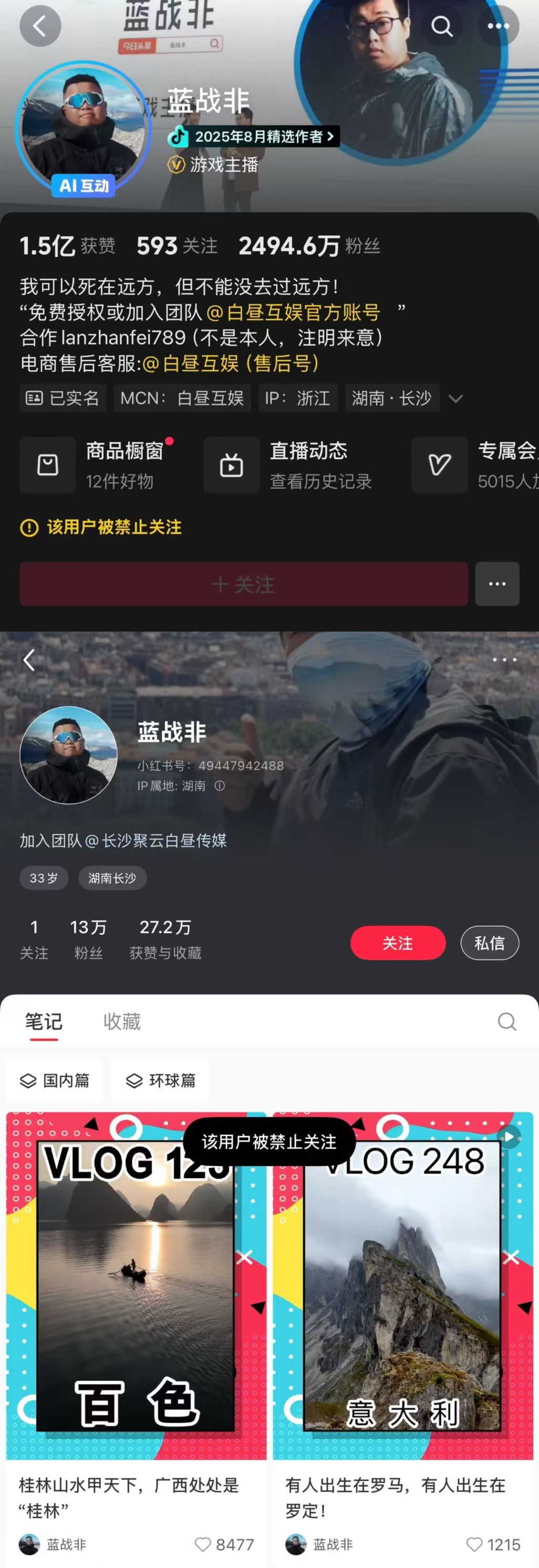 9月25日,记者查询发现,千万粉丝博主蓝战非抖音、小红书账号被禁止关注。截至目前,其抖音粉丝近2500万。