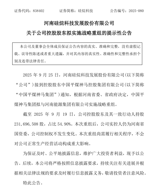 硅烷科技9月25日晚间公告称,9月25日,公司接到控股股东中国平煤神马集团通知,根据河南省委、省政府决定,中国平煤神马集团拟与河南能源集团实施战略重组。截至9月19日,中国平煤神马集团及其一致行动人持股约为2.32亿股,占比54.90%。本次重组后,公司实控人仍为河南省国资委,公司控制权不发生变化。本次重组尚需履行相关程序,不会对公司正常生产经营活动构成重大影响。 ![]()