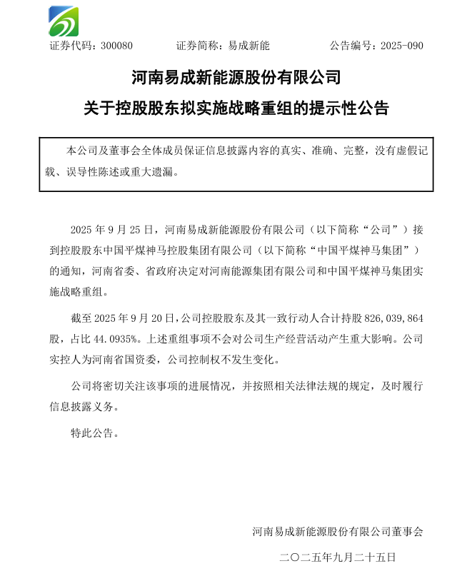 易成新能9月25日晚间公告称,公司接到控股股东中国平煤神马集团的通知,河南省委、省政府决定对河南能源集团和中国平煤神马集团实施战略重组。截至9月20日,中国平煤神马集团及其一致行动人合计持股约为8.26亿股,占比44.0935%。上述重组事项不会对公司生产经营活动产生重大影响。公司实控人为河南省国资委,公司控制权不发生变化。 ![]()