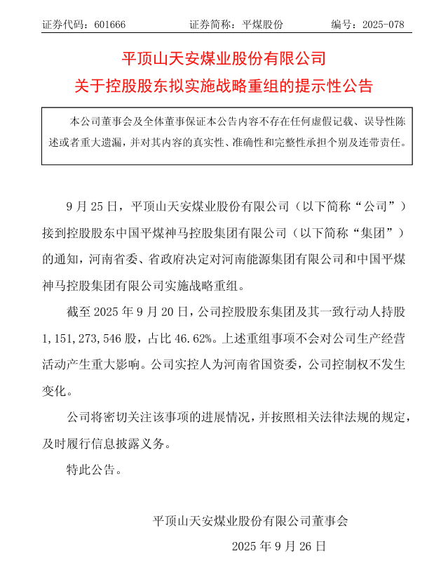 平煤股份9月25日晚间公告称,公司接到控股股东中国平煤神马集团通知,河南省委、省政府决定对河南能源集团和中国平煤神马集团实施战略重组。截至9月20日,中国平煤神马集团及其一致行动人持股约为11.51亿股,占比46.62%。上述重组事项不会对公司生产经营活动产生重大影响。公司实控人为河南省国资委,公司控制权不发生变化。 ![]()