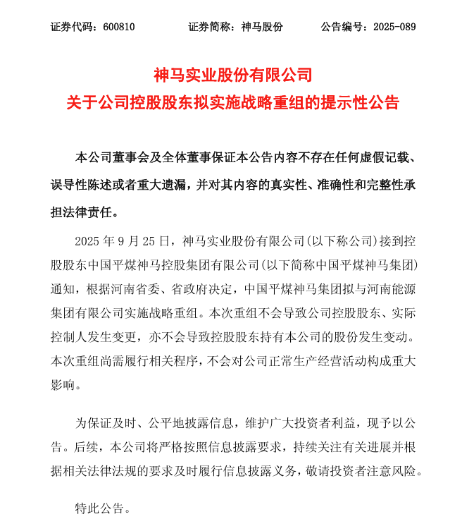 神马股份9月25日晚间公告称,公司接到控股股东中国平煤神马集团通知,根据河南省委、省政府决定,中国平煤神马集团拟与河南能源集团实施战略重组。本次重组不会导致公司控股股东、实际控制人发生变更,也不会导致控股股东持有公司的股份发生变动。本次重组尚需履行相关程序,不会对公司正常生产经营活动构成重大影响。 ![]()