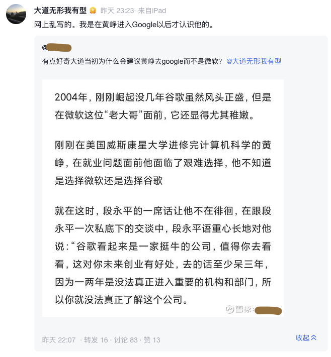 9月25日晚间,知名投资人段永平回复网友提问时澄清,他是在黄峥进入谷歌以后才认识他的,未曾对他选择微软还是谷歌的offer给出建议。