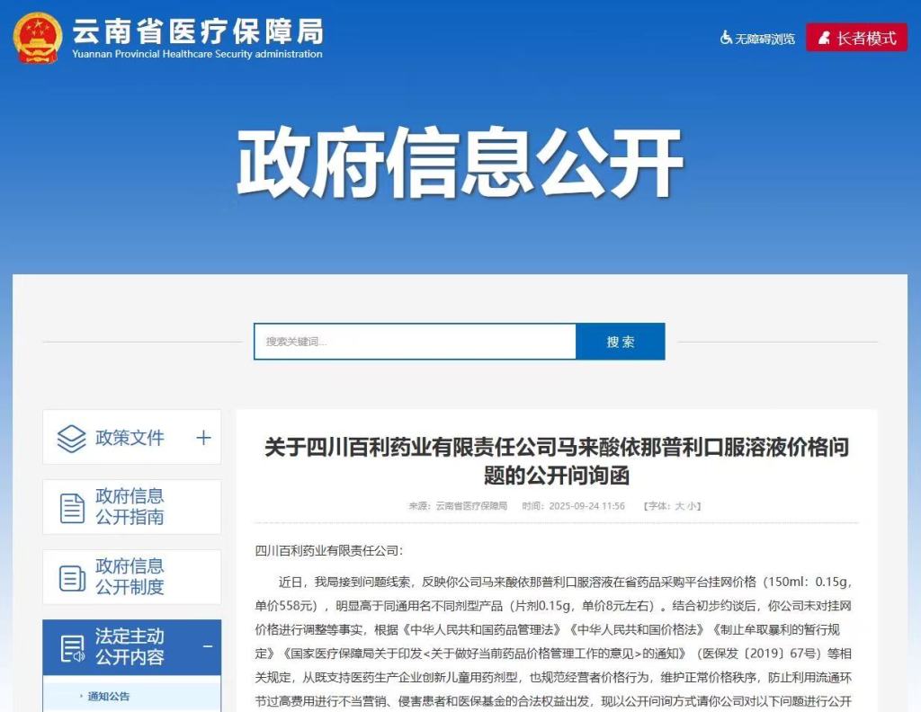 9月24日,云南省医保局向四川百利药业有限责任公司(以下简称“百利药业”)发出公开问询函,就其生产的马来酸依那普利口服溶液挂网价格高达558元,与同通用名不同剂型(片剂,单价8元左右)存在近70倍价差的问题,要求企业作出公开答复。 ![]() 问询函中,云南省医保局要求百利药业在9月30日前就以下四大问题作出书面答复: 一、请详细说明你公司马来酸依那普利口服溶液的出厂价格、终端价格,以及研发投入、生产制造、期间费用等各项价格构成情况。 二、请详细说明你公司马来酸依那普利口服溶液近5年各年度销售量、销售金额,以及你公司作为生产研发企业的实际利润等情况。 三、请详细说明你公司马来酸依那普利口服溶液出厂价格和终端价格之间价差的合理性、必要性,以及终端价格构成中所含全部销售费用的资金支出去向等情况。 四、请正面回应你公司马来酸依那普利口服溶液销售过程中是否存在通过代理商抬高挂网价格、实施不正当营销行为,进而增加患者和医保基金负担等问题。 资料显示,马来酸依那普利是一种血管紧张素转化酶抑制剂(ACEI),呈白色至灰白色结晶性粉末,临床主要用于治疗各期原发性高血压、肾性高血压及充血性心力衰竭,并能改善症状性心衰患者的生存率及降低住院风险。 值得一提的是,这并非该药首次因价格问题被关注。 9月15日,上海阳光医药采购网发布通知,因部分企业未按要求调整药品价格,自9月16日0时起暂停包括四川百利药业该款口服溶液在内的15个品规药品采购资格。 也就是说,在短短十天内,百利药业的马来酸依那普利口服溶液已接连受到两地监管机构的重点关注。 马来酸依那普利主要剂型为片剂,包括普通片剂、分散片、口腔崩解片等,多次被纳入国家集采。 以扬子江药业集团江苏制药股份有限公司生产的马来酸依那普利片为例,经过两次降价,集采前售价为19.15元/盒,集采后8.93元/盒,2022年续约后再次降到5.66元/盒,整体降价幅度70.4%。 资料显示,百利药业是上市公司百利天恒(688506.SH)的全资子公司,创建于1996年,公司的掌舵者是朱义。1963年,朱义出生于四川南充,1984年于四川大学无线电专业毕业,之后去往复旦大学攻读生物学知识。1996年,朱义创办百利药业,主要研制化学仿制药和中成药。 今年上半年,百利药业实现营业收入1.13亿元,占百利天恒营业收入的66%,净利润亏损2347.9万元。 上半年,百利天恒实现营业收入为1.71亿元,同比下降96.9%;归母净利润亏损11.2亿元,同比下降124.0%;扣非归母净利润亏损11.8亿元,同比下降125.3%。 百利天恒主要分两大业务板块,包括化学药业务板块,主要生产和销售仿制药和中成药,这是公司当前稳定的收入来源。