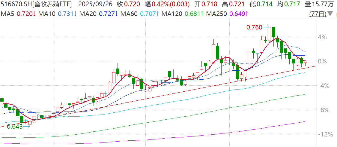 猪价再创新低! 根据国家统计局数据,9月中旬生猪(外三元)价格为13元/千克,创阶段新低。期货方面,生猪主力期货LH2511继续下跌,盘中一度跌至12.595元/公斤,创阶段低价。 二级市场则在近期回调后今日反弹,立华股份、温氏股份、海大集团涨超1%,巨星农牧、圣农发展、牧原股份小幅上涨。畜牧养殖ETF(516670)涨0.56%,近10个交易日获资金净流入合计1.17亿元。 ![]() 江海证券援引涌益咨询的数据,从8月份以来,生猪出栏体重持续走高,从127.8公斤增加到9月份的128.45公斤。 随着猪价不断走低,生猪养殖利润全面跌破成本线。根据博亚和讯数据,9月19日当周,外购仔猪养殖利润为-199.31元/头,自繁自养养殖利润为-24.44元/头,也意味着继盈利超16个月后,养殖端再度陷入全面亏损。 江海证券分析认为,这表明养殖户前期持续压栏,后续出栏肉猪供应量较大,生猪价格或将持续走低。目前生猪均价低于部分生猪养殖企业成本线,不少养殖企业开始亏损,供给压力逐步显现。 在亏损压力下,产能调控不断推进。据证券时报,9月16日,农业农村部畜牧兽医局会同国家发展和改革委员会价格司在京召开生猪产能调控企业座谈会,牧原、温氏、新希望、新五丰、唐人神等25家头部猪企代表参会。会议强调年内相关政策主要聚焦“控二育”,将“控能繁”任务细化并分配至各养殖主体,要求25家头部猪企在年底前减产100万头。对其他养殖主体,各部门联动进行统一管控。 江海证券认为,在“反内卷”的政策调控和亏损减产的双重驱动下,行业产能有望迎来加速去化期,可左侧布局生猪养殖板块。 畜牧养殖ETF(516670)紧密追踪中证畜牧养殖指数,标的指数覆盖生猪养殖产业链,据招商基金根据Wind概念划分,与养猪相关概念成份股权重合计占比约60%,包括牧原股份、温氏股份、巨星农牧、新希望等生猪养殖企业;疫苗、饲料等养猪上下游+禽类、水产等养殖概念占比约40%。费率方面,管理费0.2%/年,同赛道品种均为0.5%/年,布局成本更低。 (文章来源:21世纪经济报道) |