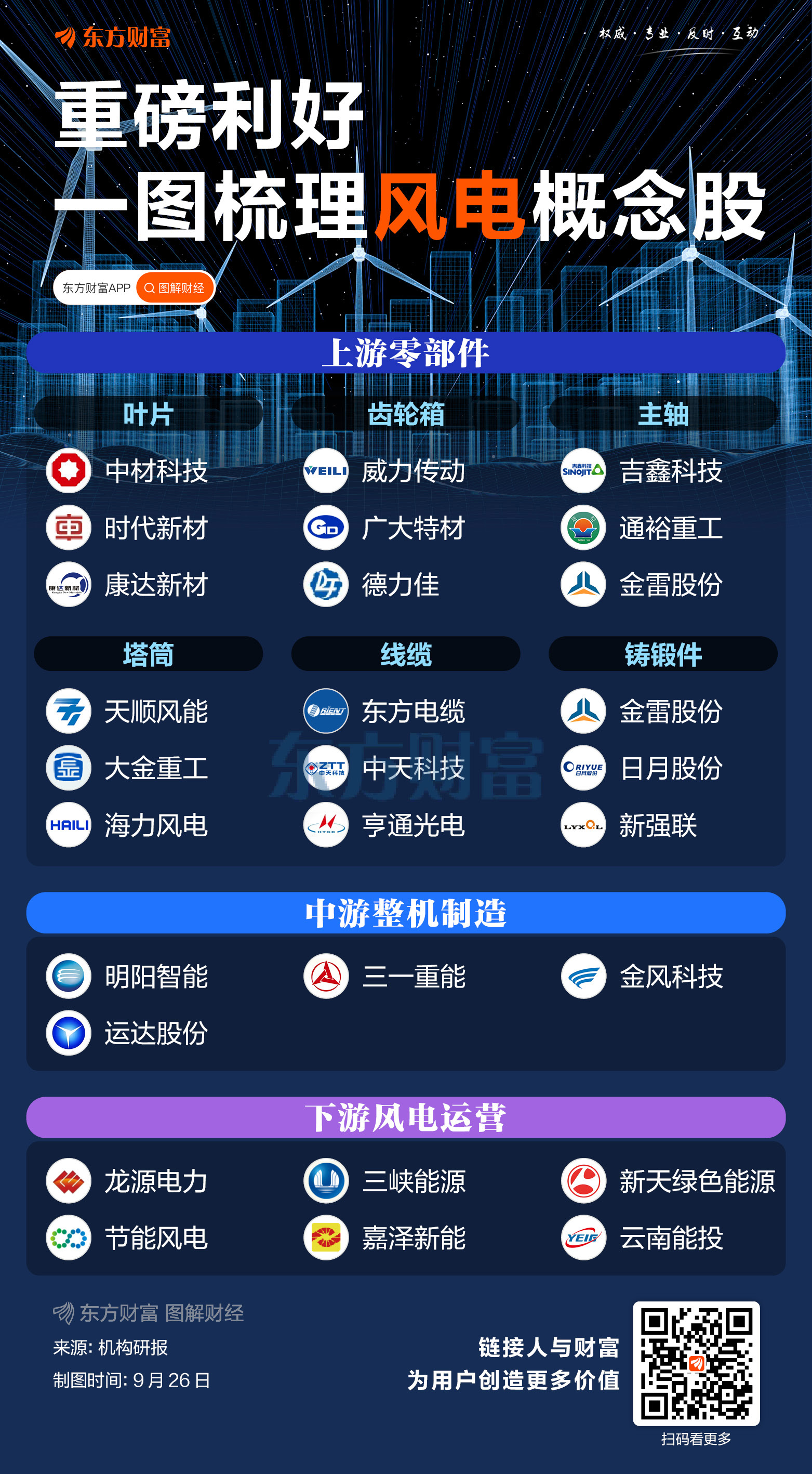 重磅利好!一图梳理风电产业链概念股 在丁冬财经看资讯行情,选丁冬财经证券一站式开户交易>> ![]() 周五(9月26日)风电设备股逆势上扬,威力传动20CM涨停,吉鑫科技、明阳智能等涨停,日月股份、天能重工、天顺风能等跟涨。 消息面上,据中国新闻网,9月24日我国在联合国气候峰会上宣布新一轮国家自主贡献目标中明确:到2035年,中国非化石能源消费占能源消费总量的比重达到30%以上,风电和太阳能发电总装机容量达到2020年的6倍以上、力争达到36亿千瓦。 国能能源研究院判断,下一个十年,风电装机保守估计将从5.2亿千瓦增长到14.75亿千瓦,风电开发将迎来发展巅峰的10年。 也有机构研报认为,反内卷成为了最近一轮风电设备价格反转的关键。2024年10月,在2024北京国际风能大会暨展览会上,包括金风科技、远景能源、运达股份、明阳智能、三一重能等在内的12家中国主流风电整机制造商,共同签署了《中国风电行业维护市场公平竞争环境自律公约》。 华福证券研报表示,2025年1-5月,国内新增风电装机量达46.28GW,同比增幅高达134%。同时,风机价格持续回暖,2025年1-7月陆风机组中标均价达1552元/kW,较2024年全年提升9%。2025年第一季度,我国陆上风电机组(含塔筒)中标平均价格已提升至2000-2200元/千瓦左右,较2024年高出200-400元/千瓦。 摩根士丹利研报表示,在行业竞争格局优化之下,中国风电产业有所复苏,在2025年初实现了价格和整体盈利能力的反转。该机构预计国内风电装机需求将保持韧性,并看好关键零部件供应商和海缆企业的投资机会。
