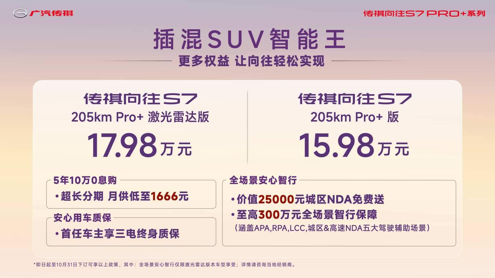9月26日,开传祺向往,过向往的生活――传祺向往S7新品用户共创大会,在广汽集团番禺总部举行。广汽传祺正式宣布旗下今年新推出的向往车系,成为湖南卫视&芒果TV《向往的生活・戏如人生》官方指定用车。 同时,作为向往系列第一车,传祺向往S7全新Pro+系列售价15.98万元起,更带来传祺史上最给力的金融政策:5年10万0息,月供低至1666元,还有价值25000元城区NDA免费送、至高300万元全场景智行保障,首任车主还可享三电终身质保,真正让“向往的生活”触手可及。 国庆期间,传祺向往S7 Pro+系列将正式登陆全国500家线下门店。新车基于大量用户调研和共创反馈,在承袭广汽大厂品质的基础上,针对热爱生活、探索多元生活的用户需求,集齐用户认可的“智能体验、电池续航、舒适座舱”三大核心优势,成为真正的“17万级插混SUV智能王”。