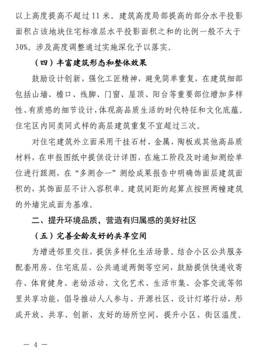 新规还引导开发商优化住宅户型设计,适应家庭人口数量和结构变化的需求,新建住宅鼓励灵活可变的户型设计,增加储物收纳空间、多功能弹性空间,提升自然采光率与通风效率。 引导好设计变成产品力 在提升小区整体环境品质方面,新规也有变化。 为了丰富建筑形态和整体效果,明确对住宅建筑外立面采用干挂石材、金属、陶板或其他高品质材料,在“多测合一”测绘成果报告中明确饰面层建筑面积的,其饰面层不计入容积率。 专家表示,变化的重要意义是,用实在的政策利好去鼓励房企进行高品质建设。过去上海的建筑规范较严格,近两年上海新房得房率普遍75%左右,很多企业不愿意做石材干挂,主要原因是以前的容积率要从外墙算起,石材干挂和墙体的中空部分也算作容积率,所以房企不愿牺牲可售面积而投入成本,导致得房率下滑。新规之后,开发商使用高品质外立面的经济成本大幅下降,有望推动高端建材在住宅项目中的普及。 再比如,多高层住宅底层设置架空层、风雨连廊用作通道、布置景观小品、居民休闲设施等公共用途的,其建筑面积不计入容积率。这将推动房企把好设计从过去的“经济负担”变成了提升产品溢价和品牌价值的主动选择,激活创新意识。 据悉,新规自9月26日起施行,主要适用于上海农村自建房外的住宅项目。保障性租赁住房、旧住房成套改造或拆除重建项目另有规定按相关规定执行。 短期来看,新规对住宅价格的直接影响有限,不会引发明显波动。不过,如果将其与此前落地的楼市新政形成政策合力,将有效为消费者注入市场信心。上海易居房地产研究院副院长严跃进表示:“上海住房设计新规的出台,有望为‘金九银十’传统销售旺季的市场行情提供有力支撑,进一步激励开发商打磨产品力,推出更具市场竞争力的住宅项目。” ![]() ![]() ![]() ![]() ![]() 全新妙想投研助理,立即体验 (文章来源:上观新闻) |