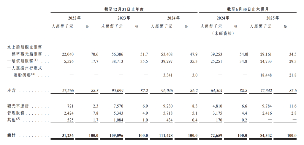 扬州市唯一一家水上游船观光服务企业正式递表港交所。 港交所9月26日披露,江苏瘦西湖文化旅游股份有限公司(瘦西湖,871343.NQ)首次提交上市申请书。 瘦西湖成立于2006年8月,前身为扬州市古运河旅游有限责任公司,在瘦西湖区经营水上游船观光,2016年4月改制为股份公司并更名。2017年,5月9日起,瘦西湖在全国中小企业股份转让系统挂牌公开转让。 水上游船观光业务占总收入85%以上 根据招股书,瘦西湖主要包含3大业务分部:1.提供水上游船观光服务,包括增值“游船+”服务及包船服务以及大运扬州夜游;2.提供观光车服务;3.提供管理服务。公司主要在扬州的知名区域运营水上游船观光服务,包括蜀冈—瘦西湖风景区和古运河区域,这些景区均为大运河联合国教科文组织世界遗产点的组成部分。 瘦西湖是持有为期20年的蜀冈—瘦西湖风景名胜区水上游船观光运营权的独家运营商,也是目前根据无限定期限专营安排,有资格在蜀冈—瘦西湖风景名胜区运营水上游船观光服务的唯一运营商。 据弗若斯特沙利文数据,2024年,瘦西湖在江苏省水上游览服务市场的船票销售额方面排名第二,约占江苏省市场份额的16.0%。 截至目前,瘦西湖共有206艘船,包括36艘摇橹船、106艘自驾船和64艘主题船,在标准运营条件下单航次总载客量为3817人,旅游高峰期每日最大承载量为超过35000人。 此外,2022年,瘦西湖还取得了蜀冈—瘦西湖风景名胜区内指定路线观光车的20年独家运营权,开始经营观光车业务。截至目前,瘦西湖拥有共计25辆观光车,在标准运营条件下单航次载客量达325人次,高峰期每日承载量最高可达13000人次。 瘦西湖指出,水上游船观光业务是公司主要收入来源。公司2022年、2023年、2024年全年以及2025年上半年,瘦西湖的水上游船观光业务分部产生的收入约为2760万元(人民币,下同)、9510万元、9600万元及7230万元,分别占有关期间总收入的约88.3%、87.2%、86.2%及85.6%。