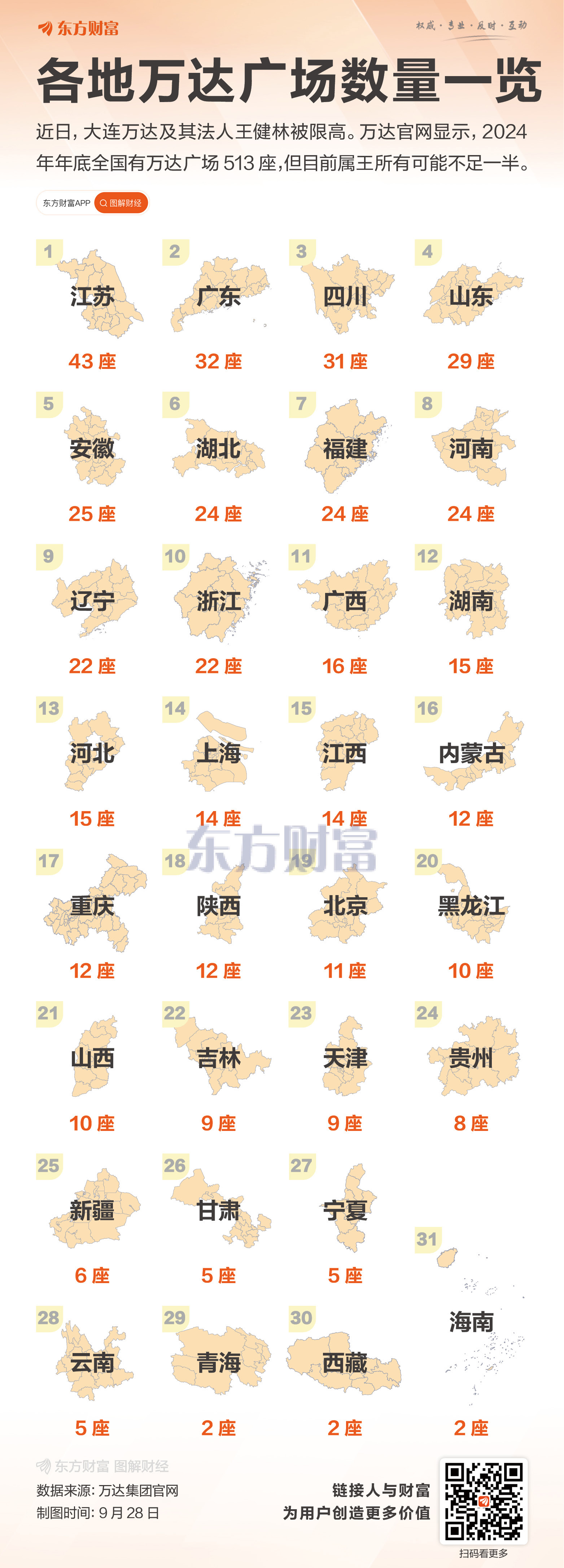 被限高!王健林手里还有多少座万达广场? 炒股第一步,先开个股票账户 ![]() 近日,大连万达集团股份有限公司(下称大连万达)及其法定代表人王健林被限制高消费,企查查案件审理流程显示,此前大连万达等公司因此案被强制执行1.86亿元。 珠海万达商业管理集团(下称珠海万达,大连万达控股78.83%)官网显示,截至2024年12月31日,其运营管理万达广场513家,商业运营总建筑面积7,079万平方米,遍布全国31个省份及合计228个城市。数据显示,拥有万达广场数量最多的前三个省份是江苏、广东和四川,分别有43座、32座和31座。拥有万达广场最少的是青海、西藏和海南,均有2座。 值得一提的是,全国513座万达广场并非全部属于万达集团所有。据珠海万达2023年6月最新的港股招股书,截至2022年底,珠海万达在管万达广场有472座,其中184座归属于独立第三方所有,也就是说2022年底,王健林手中仅有288座万达。 据综合媒体统计,2023至2024年至少有30家被出售。今年年初,又先后有宣城、铜陵、安阳、四平、扬州5座万达广场被出售。5月26日,48家万达广场被打包出售,收购方阵营包括太盟投资集团、腾讯控股、阳光人寿保险、京东系资本等,涉及北京、上海、成都、广州、武汉等地的万达广场。 以2022年底的288座计算,2023年至今至少有83座万达广场被出售,那么目前王健林手中万达广场数量可能还剩200多座,不足全国513座的一半。