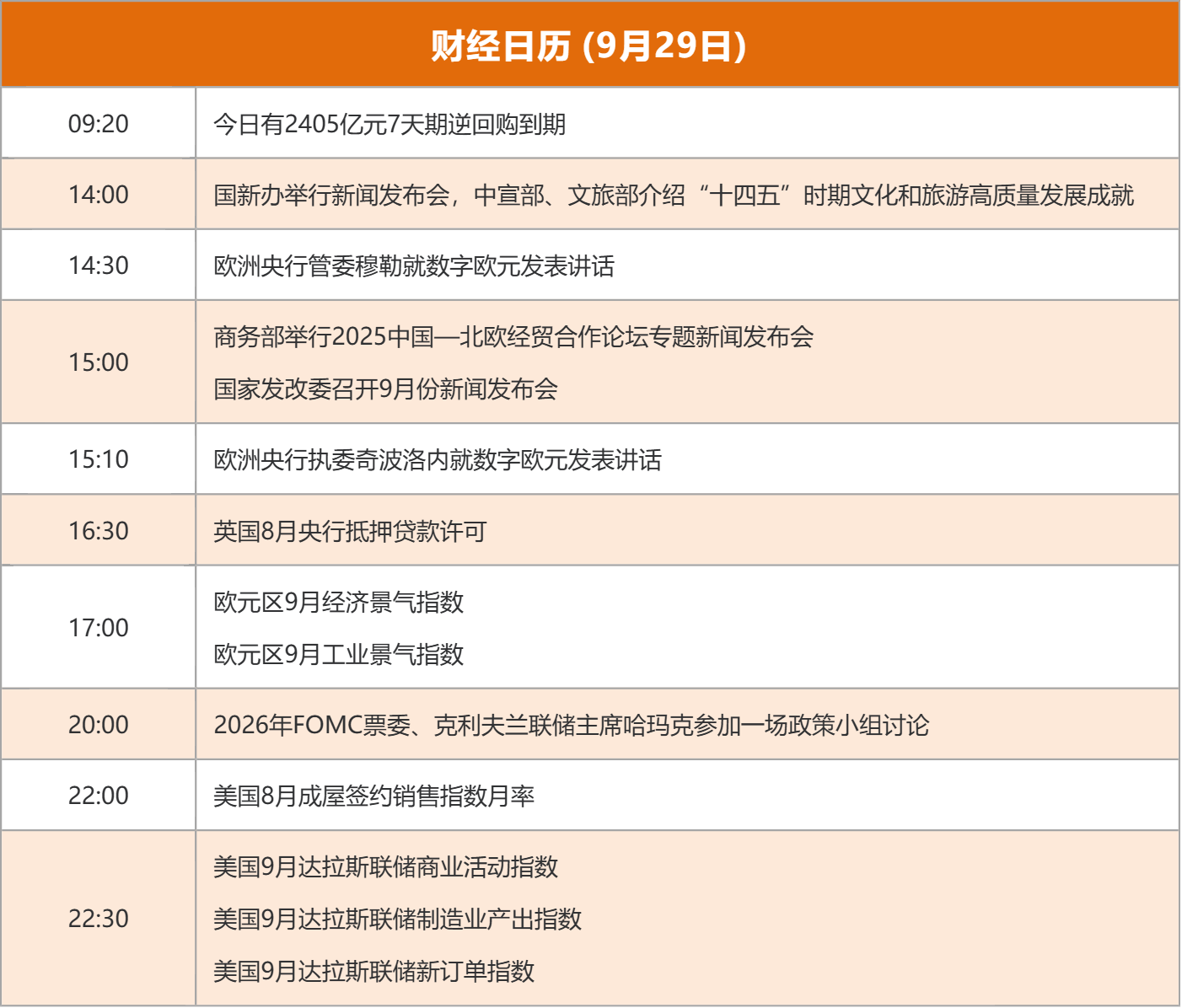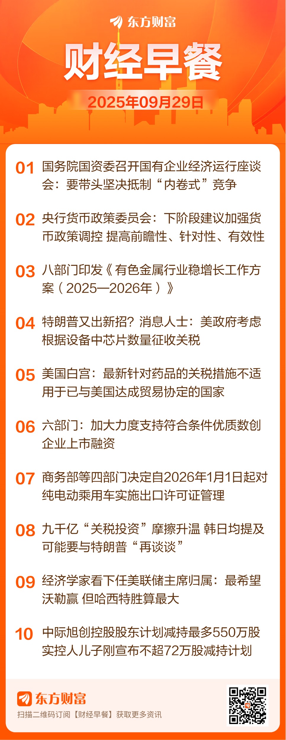 ![]() 每日精选央行会议: 中国人民银行货币政策委员会召开2025年第三季度例会。会议研究了下阶段货币政策主要思路,建议加强货币政策调控,提高前瞻性、针对性、有效性。会议指出,用好证券、基金、保险公司互换便利和股票回购增持再贷款,探索常态化的制度安排,维护资本市场稳定。 工业企业利润: 1—8月份,全国规模以上工业企业实现利润总额46929.7亿元,同比增长0.9%。1—8月份,规模以上工业企业中,国有控股企业实现利润总额15156.5亿元,同比下降1.7%;股份制企业实现利润总额34931.9亿元,增长1.1%;外商及港澳台投资企业实现利润总额11723.6亿元,增长0.9%;私营企业实现利润总额13076.1亿元,增长3.3%。 芯片: 环球网援引路透社9月26日报道称,美国政府试图推动“制造业回流”之际,三名消息人士透露,特朗普政府正在考虑根据每台外国电子设备中的芯片数量征收关税。报道介绍,根据该计划,美国商务部将对产品芯片价值的估算部分按一定比例征收关税。该计划目前尚未公布,也可能会有所变化。美国商务部没有立即回应置评请求。 药品关税: 当地时间9月26日,美国白宫表示,最新针对药品的关税措施不适用于已与美国达成贸易协定的国家。此前一天,美国总统特朗普在其社交媒体“真实社交”宣布,将自10月1日起对进口的所有品牌或专利药品征收100%关税。 反内卷: 据国务院国资委网站,9月25日,国务院国资委党委书记、主任张玉卓主持召开部分国有企业经济运行座谈会,了解企业经济运行情况、面临的困难挑战,聚焦稳电价、稳煤价、防止“内卷式”恶性竞争等,听取企业意见建议,进一步研究夯实企业高质量发展基础的政策举措。 算力资源: 国家发展改革委等6部门日前印发《关于加强数字经济创新型企业培育的若干措施》。其中提到,强化算力资源供给支撑。深入实施“东数西算”工程,落实有关政策文件要求,坚持国家枢纽节点算力规模部署,持续优化热点应用区域需求保障。加快构建全国一体化算力网,支持地方协同参与、共同建设,在国家统一标准指导下,推动全国算力资源有序池化,并网运行,打造集算力统筹监测、统一调度、弹性供给、安全保障于一体的新型算力网基础设施。 电车出口: 据商务部网站,为促进新能源汽车贸易健康发展,依据《中华人民共和国对外贸易法》有关规定,商务部等四部门决定自2026年1月1日起对纯电动乘用车实施出口许可证管理。管理范围包括仅装有驱动电动机的具有车辆识别代码(VIN码)的其他载人车辆(参考海关商品编号为8703801090)。 债券回购: 2025年9月26日,中国人民银行、中国证监会、国家外汇局联合发布公告,支持可在中国债券市场开展债券现券交易的境外机构投资者开展债券回购业务。此举不仅有利于满足市场需求,进一步增强人民币债券资产吸引力,也有利于优化合格境外投资者制度,巩固提升香港国际金融中心地位,助力在岸离岸人民币市场协同发展。 热点题材果链: 苹果公司据称已开发出一款类似ChatGPT的iPhone应用,用于测试和准备定于明年推出的Siri重大升级。知情人士透露,苹果的人工智能(AI)部门正在使用该应用快速评估Siri的新功能,包括搜索个人数据(如歌曲和电子邮件),以及执行应用内操作(如编辑照片)。这款软件代号为 Veritas(拉丁语意为“真理”),目前仅供内部使用,苹果暂时没有将其面向消费者发布的计划。 存储: 继闪迪、美光、三星及西部数据宣布涨价之后,存储模组大厂威刚在日前宣布,自29日起停止DDR4报价,DDR5与NAND闪存优先供应主要客户;NAND闪存控制芯片大厂群联则已在近日恢复部分报价,价格涨幅约10%,被看作NAND闪存市场的“开涨信号”。 白酒: 消费疲软叠加政策调整,今年中秋白酒整体销售再度遇冷。据媒体报道,今年中秋白酒动销延续去年同期下滑态势,而业内普遍反馈中秋白酒动销“不太好”,销售同比下降20%以上是普遍现象,终端渠道商仍面临不赚钱、信心弱的情况。 汽车: 江苏省商务厅调整汽车以旧换新政策,其中提到汽车置换更新补贴政策于2025年9月28日24:00暂停实施。2025年1月1日(含当日,下同)至9月28日间取得新车《机动车销售统一发票》,符合汽车置换更新补贴政策申报条件的消费者,须在2025年10月20日24:00前提交完整的申报资料,逾期不再受理新的补贴申请。 AI+交通运输: 交通运输部等七部门印发《关于“人工智能+交通运输”的实施意见》。其中提出,到2027年,人工智能在交通运输行业典型场景广泛应用,综合交通运输大模型体系落地部署,普及应用一批智能体,建成一批“人工智能+交通运输”标志性创新工程,人工智能成为引领交通运输创新发展的重要动力。 有色金属: 工业和信息化部等八部门印发《有色金属行业稳增长工作方案(2025—2026年)》,其中提到,2025—2026年,有色金属行业增加值年均增长5%左右,经济效益保持向好态势,十种有色金属产量年均增长1.5%左右,铜、铝、锂等国内资源开发取得积极进展,再生金属产量突破2000万吨,高端产品供给能力不断增强,绿色低碳、数字化发展水平持续提升。 石油化工: 工业和信息化部等7部门印发《石化化工行业稳增长工作方案(2025-2026年)》。其中提出,2025—2026年,石化化工行业增加值年均增长5%以上,经济效益企稳回升,产业科技创新能力显著增强,精细化延伸、数字赋能和本质安全水平持续提高,减污降碳协同增效明显,化工园