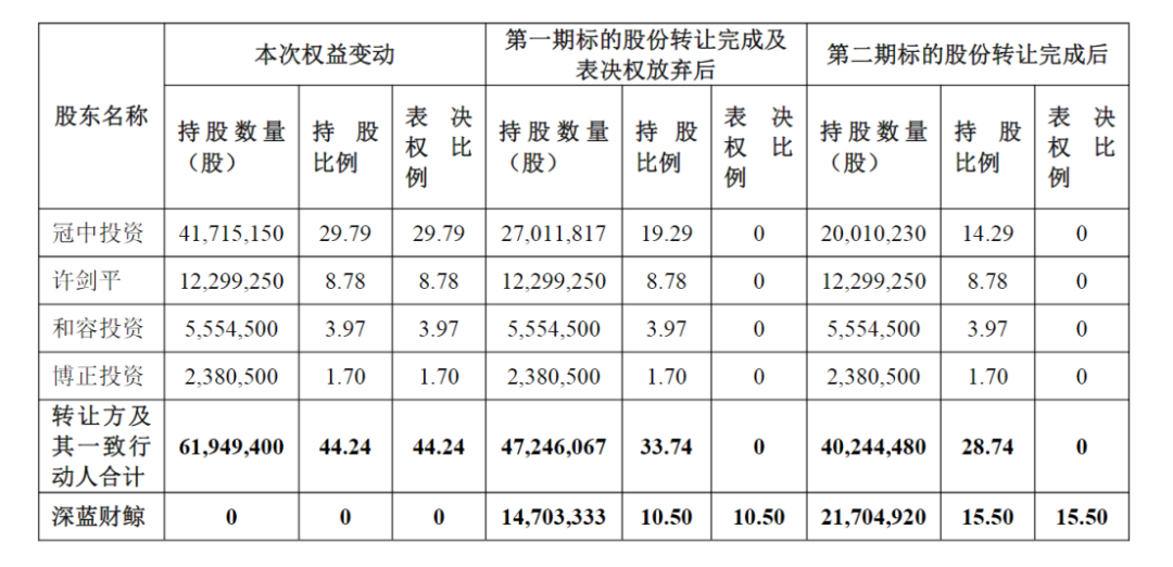 全新妙想投研助理,立即体验 停牌多日后,冠中生态(300948)的“新主”揭开面纱。 9月28日晚间,冠中生态公告称,公司控股股东冠中投资及公司实控人李春林、许剑平与深蓝财鲸于9月26日签署股份转让协议,约定冠中投资分两期合计向深蓝财鲸转让所持有公司15.5%的股份。 同日,冠中投资、许剑平、和容投资、博正投资与深蓝财鲸签署表决权放弃协议。冠中投资、李春林、许剑平及和容投资、博正投资以及公司持股5%以上股东杨恩光出具不谋求控制权的承诺函。 若上述第一期标的股份转让、表决权放弃以及不谋求控制权承诺全部完成后,深蓝财鲸将成为冠中生态的控股股东,靳春平将成为上市公司的实际控制人。冠中生态股票及可转债将于9月29日复牌。 拟打“组合拳”易主 公告显示,冠中生态本次控制权变更方案整体包括三大步骤:控股股东冠中投资的股份协议转让;冠中投资及其一致行动人的剩余全部表决权放弃;冠中投资、实际控制人李春林和许剑平及其一致行动人和公司持股5%以上股东出具关于不谋求控制权的承诺函三个部分。 根据股份转让协议,冠中投资拟分两期合计向深蓝财鲸转让所持有的冠中生态约2170.49万股股份,占公司股份总数的15.50%。其中,第一期标的股份为1470.33万股,占上市公司股份总数的10.50%。 第一期标的股份的协议转让价格为15元/股,较冠中生态停牌前最后一个交易日(9月19日)收盘价11.20元/股溢价近34%,合计转让价款约为2.21亿元。 在第一期标的股份交割完成的前提下,第二期标的股份为冠中投资持有的冠中生态约700.16万股股份,占上市公司股份总数的5.00%,将于2026年3月31日前或者双方协商确定的2026年内其他时间转让并完成交割。 据公告,第二期标的股份的转让价格为第二期股份转让协议签署日公司股份大宗交易价格的下限与第一期标的股份转让价格(复权后)孰高值。 9月26日,冠中投资、许剑平、和容投资、博正投资与深蓝财鲸签署表决权放弃协议,约定在第一期10.50%股权转让完成后,合计放弃其转让后剩余持有的全部4724.61万股股份所对应的表决权。 根据公告,上述弃权期限为股份转让协议约定的第一期标的股份交割日起36个月。其中,股份转让协议约定的第二期标的股份交割日起,第二期标的股份对应的表决权恢复。 为了维护和确保深蓝财鲸取得公司控制权后的控制权稳定,9月26日,冠中投资、李春林、许剑平及和容投资、博正投资以及公司持股5%以上股东杨恩光还出具了不谋求控制权的承诺函。 在上述系列交易“组合拳”下,冠中生态将完成易主。根据公告,前述协议转让中第一期10.50%的股份协议转让、表决权放弃以及不谋求控制权承诺全部完成后,冠中生态的控股股东变更为深蓝财鲸,实际控制人变更为靳春平。 ![]() 图片来源:冠中生态详式权益变动报告书 新控股股东成立不满三个月 公告显示,深蓝财鲸成立日期为2025年7月21日,经营范围包括人工智能基础软件开发;技术服务、技术开发、技术咨询等,注册资本为6亿元。 ![]() 图片来源:冠中生态详式权益变动报告书 股权穿透后,深蓝财鲸的有限合伙人为沈如君和深圳市花舞科技有限公司,出资比例分别为65%、34%。深蓝企服持有深蓝财鲸1%合伙份额,担任其执行事务合伙人。 ![]() 图片来源:冠中生态详式权益变动报告书 截至详式权益变动报告书签署日,靳春平担任深蓝财鲸执行事务合伙人委派代表,并持有深蓝企服90%股权,为深蓝财鲸实际控制人。 ![]() 靳春平直接控制的其他核心企业情况图片来源:冠中生态详式权益变动报告书 对于此次入主冠中生态的理由,深蓝财鲸表示,公司认同上市公司长期价值,拟通过本次权益变动取得上市公司的控制权。公司成为上市公司控股股东后,将结合自身在人工智能财税领域的核心技术、产业链资源等方面的优势,依托上市公司平台,为上市公司业务发展赋能。 据公告,深蓝财鲸及靳春平承诺,本次权益变动完成后,直接/间接持有的上市公司股份在18个月内不得对外转让。 资料显示,冠中生态聚焦生态环境建设主业,覆盖包括植被恢复、水土保持、防沙治沙、土壤修复、土地整治、水环境治理等自然环境生态修复业务,以及景观园林、市政工程、环卫保洁等人工环境生态建设业务。 深蓝财鲸在详式权益变动报告书中称,截至该报告书签署日,公司无在未来12个月内改变上市公司主营业务或者对上市公司主营业务作出重大调整的计划。 值得关注的是,9月28日晚间,冠中生态还披露,公司与杭州精算家人工智能技术有限公司(简称“杭州精算家”)的11名股东签署了意向协议,拟以支付现金的方式收购杭州精算家51%的股权。其中,深圳市花舞科技有限公司在杭州精算家的持股比例超过56%,为此次冠中生态的交易对象之一。 杭州精算家主营业务聚焦企业服务数字化领域,依托自主研发智能财税产品等核心工具,为中小微企业提供覆盖全流程的定制化财税服务。据公告,杭州精算家整体估值暂定为不高于5.6亿元。 想炒股,先开户!选丁冬财经证券,行情交易一个APP搞定>> (文章来源:上海证券报) |