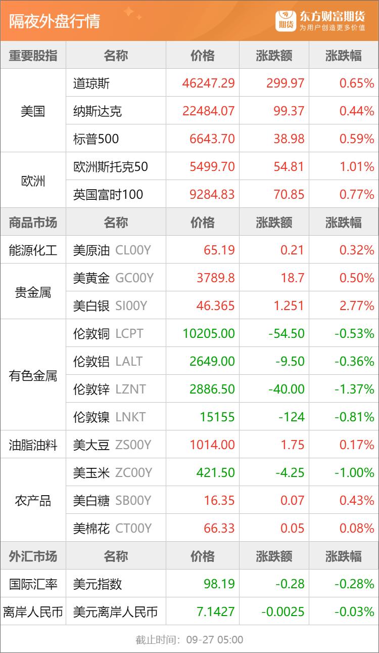 隔夜行情![]() ![]() 每日精选八部门印发《有色金属行业稳增长工作方案(2025—2026年)》 铜是新石油!高盛:电网已成为美国能源安全的“薄弱环节” 重磅文件印发 对化工品有何影响?来看解读 宏观产经央行网站:中国人民银行货币政策委员会2025年第三季度(总第110次)例会于9月23日召开。会议研究了下阶段货币政策主要思路,建议加强货币政策调控,提高前瞻性、针对性、有效性,根据国内外经济金融形势和金融市场运行情况,把握好政策实施的力度和节奏,抓好各项货币政策措施执行,充分释放政策效应。 国家统计局:1—8月份,全国规模以上工业企业实现利润总额46929.7亿元,同比增长0.9%。1—8月份,规模以上工业企业中,国有控股企业实现利润总额15156.5亿元,同比下降1.7%;股份制企业实现利润总额34931.9亿元,增长1.1%;外商及港澳台投资企业实现利润总额11723.6亿元,增长0.9%;私营企业实现利润总额13076.1亿元,增长3.3%。 国资委:9月25日,国务院国资委党委书记、主任张玉卓主持召开部分国有企业经济运行座谈会,了解企业经济运行情况、面临的困难挑战,聚焦稳电价、稳煤价、防止“内卷式”恶性竞争等,听取企业意见建议,进一步研究夯实企业高质量发展基础的政策举措。国务院国资委党委委员、副主任李镇出席会议。 品种资讯黑色系期货 焦煤:9月26日,中国炼焦行业协会发布严正声明:中国炼焦行业协会从未发布或授权任何关于“强制限产”“联合提价”的通知或倡议。协会始终严格遵守国家法律法规,坚决维护公平竞争的市场环境。涉事机构及个人应立即停止侵权行为,协会保留追究其法律责任的权利。(界面新闻) 锰硅:锰硅下游客户采购情绪较为谨慎,叠加企业让价出货情绪不强,本周(9月22日至9月26日)锰硅企业库存仍有增幅。Mysteel统计全国63家独立硅锰企业库存量为233800吨,环比增加34900吨,创近17个月来新高。其中宁夏产区企业库存涨幅最为明显环比上涨30600吨至169000吨。(我的钢铁网) 硅铁:据Mysteel,钢厂开工回升,本周(9月22日至9月26日)Mysteel统计五大钢种硅铁周需求为19865.9吨,环比上周增长1.42%。不过硅铁厂家投产节奏稳定,其周产量也环比上涨0.14吨至11.45万吨。供需双增下,本周硅铁需求供应比微幅回升,环比上涨0.03%至17.35%。(我的钢铁网) 农产品期货 生猪:据农业农村部监测,截至9月28日14:00时,全国农产品批发市场猪肉平均价格为19.17元/公斤,较本周五下降1.3%;鸡蛋平均价格为8.50元/公斤,较本周五上升0.5%。(新华财经) 棕榈油:南部半岛棕榈油压榨商协会(SPPOMA)数据显示,2025年9月1-25日马来西亚棕榈油单产环比上月同期减少3.19%,出油率环比上月同期下降0.18%,产量环比上月同期减少4.14%。 据船运调查机构SGS公布数据显示,预计马来西亚9月1-25日棕榈油出口量为795947吨,较上月同期出口的933437吨减少14.73%。(新华财经) 鸡蛋:蛋鸡存栏量仍处于历史较高水平,叠加冷库蛋逐步出库,市场供应宽松。9月28日主产区山东鸡蛋均价7.28元/公斤,与昨日价格持平;河北鸡蛋均价6.64元/公斤,较昨日价格下跌0.05;广东鸡蛋均价7.67元/公斤,与昨日价格持平;北京鸡蛋均价7.20元/公斤,与昨日价格持平。(中国饲料行业信息网) 有色/贵金属期货 沪金:在本周(9月22日至9月26日)黄金价格创下新高之后,摩根大通策略师表示,到2026年年中,黄金价格预计将达到每盎司4050美元至4150美元的区间,未来有望再创新高。(财联社) 白银:9月26日,国际白银价格强势上行,伦敦现货白银突破46美元/盎司,最高触及46.62美元/盎司,创下自2010年以来的14年新高。在过去六个月内,现货白银累计涨幅已超过30%,表现远超多数大宗商品,年内涨幅更是达到59%,也超过黄金的43%涨幅。(证券时报网) 碳酸锂:盐湖股份9月28日公告,公司4万吨/年基础锂盐一体化项目已基本建成,关键装置吸附提锂装置试车产出合格液,纳滤反渗透系统完成膜安装及水联动,沉锂及公辅工程完成核心设备单机试车,正式进入投料试车阶段并产出合格的电池级碳酸锂产品。(人民财讯) 9月28日,记者实探位于江西省宜春市宜丰县工业园的龙蟠时代工厂,工厂内部人士向记者确认,龙蟠时代已于9月25日停产,大部分员工已经放假,预计可能要到11月才正式复产。龙蟠时代成立于2022年3月,是宁德时代宜春锂矿矿区配套的冶炼厂之一,龙蟠科技持股70%,宁德时代持股30%。(第一财经) 多晶硅:随着国庆假期临近,多晶硅现货市场活跃度减弱,本周(9月22日至9月26日)多晶硅企业报价无明显调整,头部厂家报价55元/千克,二三线厂家报价52-53元/千克,但亦有部分二线厂家调涨至55元/千克,颗粒料持稳51元/千克报价。光伏硅片市场各尺寸价格暂未进一步上调,进入高位盘整阶段。(我的钢铁网) 能化期货 原油:伊拉克石油部官员称,伊拉克-土耳其输油管道的恢复运营将在未来几天内使原油出口量升至近360万桶/日。伊拉克的生产和出口水平将维持在欧佩克设定的420万桶/日配额内。 消息人士:欧佩克+可能在10月5日的会议上将石油产量至少上调13.7万桶/日。(财联社) OPEC+据悉或考虑11月再度增产,继续夺回市场份额。(财联社) 玻璃:据中国贸易救济信息网,9月26日,墨西哥经济部发布公告称,应墨西哥生产商申请,对原产于中国的厚度大于等于2毫米且小于等于19毫米的有色浮法玻璃启动反倾销调查。本案倾销调查期为2024年1月1日~2024年12月31日,损害调查期为2022年1月1日~2024年12月31日。公告