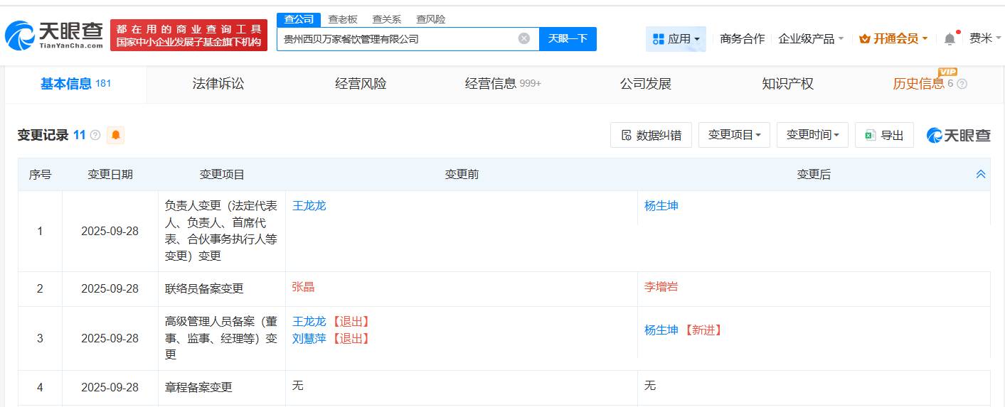 天眼查App显示,近日,贵州西贝万家餐饮管理有限公司发生工商变更,王龙龙卸任法定代表人,由杨生坤接任,同时发生高管变更。贵州西贝万家餐饮管理有限公司成立于2018年3月,注册资本500万人民币,经营范围包括餐饮管理、餐饮服务等。股东信息显示,该公司由内蒙古西贝餐饮集团有限公司、北京喜悦人生餐饮管理合伙企业(有限合伙)共同持股。值得一提的是,此前,广州西贝餐饮有限公司、珠海市西贝餐饮有限公司均发生工商变更。