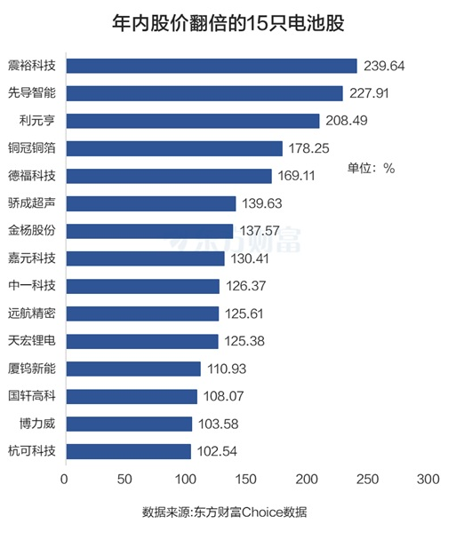 固态电池再迎利好 拿固态电池来说,近期就利好消息不断。比如日前清华大学化工系教授张强领衔的团队在锂电池聚合物电解质研究领域取得重要进展,为开发实用化的高安全性、高能量密度固态锂电池提供了新思路与技术支撑,相关成果已在线发表于《自然》杂志。 工信部等八部门联合印发的《新型储能制造业高质量发展行动方案》也明确将固态电池列为重点攻关方向,支持锂电池、钠电池向固态化发展,并计划在2027年前打造3至5家全球龙头企业。 不少上市公司也纷纷公开表示了固态电池业务的进展,比如璞泰来表示公司已在固态电池多个制造环节进行发力布局,并已经实现向国内外头部客户交付干法和固态电池极片设备;赢合科技则表示,公司已推出覆盖湿法与干法工艺的固态电池最新解决方案,目前公司已向多家客户交付了核心固态电池相关设备等等。 东吴证券预计,固态电池行业25H2-26H1将进入中试线落地关键期,2026年中试线优化+样车路试,2027年开启小规模量产装车,行业出货有望突破1GWh,2030年大规模量产,规模有望突破100GWh。 中信建投也认为,固态电池作为下一代高性能电池技术,凭借高能量密度、高安全性等显著优势,正加速从实验室走向产业化。随着政策红利释放、市场需求升级和技术持续迭代,全球固态电池产业已从实验室研发进展到商业化落地的关键阶段。中国在固态电池领域政策支持力度大,随着行业技术标准体系逐步完善,2027年前后有望实现全固态电池小批量生产。 动力电池装车量高增长 再者,新能源车销量的持续高增长,也支撑着电池板块走强。中汽协披露的数据显示,8月新能源车销量为139.5万辆,同比增长26.8%。前8个月,新能源车合计销量962万辆,同比增长36.7%,新能源汽车新车销量达到汽车新车总销量的45.5%。 其中新能源车出口数据更加亮眼。中汽协的数据显示,8月新能源车出口22.4万辆,同比增长1倍。前8个月合计出口153.2万辆,同比增长87.3%。 而中国汽车动力电池产业创新联盟披露的数据显示,8月我国动力电池装车量为62.5GWh,同比增长32.42%。今年前8个月的动力电池装车量合计达418.1GWh,同比增长43.09%。 全球而言,SNE Research数据显示,2025年上半年全球动力电池装车量达504.4GWh,同比增长37.3%。 ![]() 海外需求带动储能业务放量 此外,近期储能市场,尤其海外储能的强劲需求,也带动了电池板块的强势。而储能市场的强劲需求,又可以从部分龙头企业储能业务的显著放量上感受到。 比如阳光电源,上半年储能业务收入178.03亿元,同比增长127.78%,占总营收的40.89%,首次超越光伏业务成为第一大收入来源。科陆电子储能业务实现收入12.82亿元,同比增长177.15%,占总营收的49.83%,首次超越智能电网业务。 还有阿特斯,截至上半年末,公司储能系统已签署合同的在手订单金额达30亿美元。公司预计,三季度储能出货量2.1~2.3GWh,全年出货量将达7~9GWh,储能业务毛利率持续领跑,成为利润增长的核心引擎。晶科能源、天合光能等行业龙头公司,也在近期纷纷表态对储能业务的重视。 而这些公司均表示了海外需求的乐观预期,阳光电源就表示,未来几年全球储能复合增长率保守估计20%,乐观估计可达30%。其中,欧洲市场大储和工商储需求都不错,处于良性竞争状态;美国市场补贴政策2033年才退坡,储能经济性较好;此外,澳洲预计2026年有10GWh的储能需求,增长强劲。 中信证券指出,国内头部储能系统集成商对未来储能需求指引超预期,26/27/28年增速指引分别翻倍/40%+/30%,看好国内储能商业模式的转变、欧洲/东南亚/南美新市场、海外数据中心新应用场景等对储能需求的拉动。 年内15只电池股翻倍 从板块个股年内表现来看,也能感受到电池板块正受到市场的青睐程度。东方财富Choice数据显示,年内申万电池板块中,在剔除年内上市新股后,震裕科技以239.64%的涨幅居首。先导智能、利元亨位列二、三位,年内分别累涨227.91%、208.49%。 整体而言,电池板块的105只个股,年内有102股上涨,上涨占比约97%。其中93股涨超10%,51股涨超50%,15股股价翻倍。整个105只个股,年内上涨中位数为49.7%。 ![]() (文章来源:东方财富研究中心) |