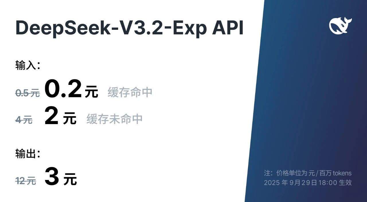 【大河财立方消息】9月29日,DeepSeek(深度求索)发布DeepSeek-V3.2-Exp模型。 DeepSeek表示,这是一个实验性的版本,V3.2-Exp在V3.1-Terminus的基础上引入了一种稀疏注意力机制,针对长文本的训练和推理效率进行了探索性的优化和验证。目前,官方App、网页端、小程序均已同步更新。 DeepSeek同时宣布,得益于新模型服务成本的大幅降低,官方API价格也相应下调,新价格即刻生效。 在新的价格政策下,输入方面,缓存命中时价格价格为0.2元/百万tokens,缓存未命中时价格为2元/百万tokens,输出方面则为3元/百万tokens,开发者调用DeepSeek API的成本将降低50%以上。
