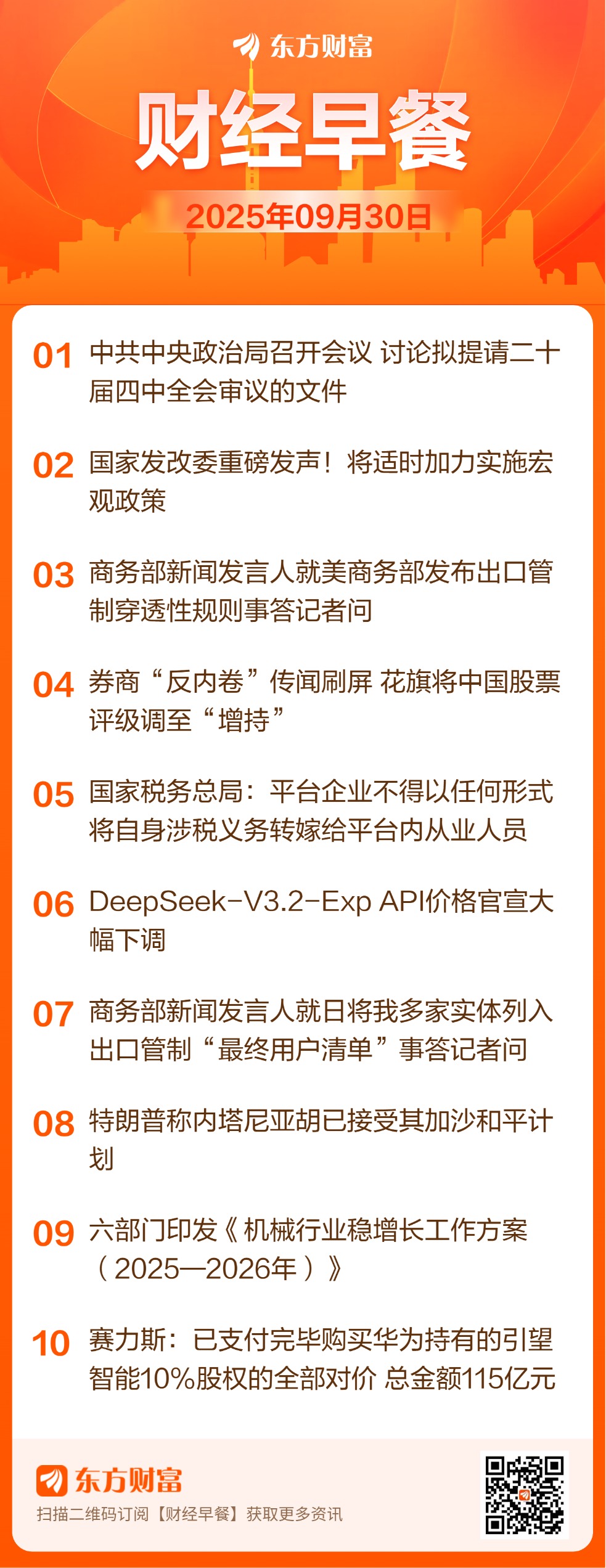 ![]() 每日精选中共中央政治局会议: 中共中央政治局9月29日召开会议,研究制定国民经济和社会发展第十五个五年规划重大问题。中共中央总书记习近平主持会议。会议决定,中国共产党第二十届中央委员会第四次全体会议于10月20日至23日在北京召开。中共中央政治局听取了《中共中央关于制定国民经济和社会发展第十五个五年规划的建议》稿在党内外一定范围征求意见的情况报告,决定根据这次会议讨论的意见进行修改后将文件稿提请二十届四中全会审议。 发改委新闻发布会: 国家发改委政策研究室副主任、新闻发言人李超在新闻发布会上表示,外部环境严峻且内需回升基础不牢,宏观政策将持续发力并“适时加力”以巩固向好势头。政策发力点高度聚焦科技与AI产业,将制定智能终端和智能体发展指引、开放行业场景、发放算力补贴,并特别支持民营企业深度参与“人工智能+”行动。此外提到新型政策性金融工具规模共5000亿元,全部用于补充项目的资本金。国家发展改革委正在会同有关方面,抓紧把新型政策性金融工具资金投入到具体项目上。 DeepSeek: 9月29日晚间,DeepSeek宣布官方App、网页端、小程序均已同步更新为DeepSeek-V3.2-Exp。DeepSeek介绍,得益于新模型服务成本的大幅降低,官方API价格也相应下调,新价格即刻生效。在新的价格政策下,开发者调用DeepSeekAPI的成本将降低50%以上。 机械行业: 工信部等六部门印发《机械行业稳增长工作方案(2025—2026年)》。其中提到,2025—2026年,机械行业运行保持平稳向好态势,重点产业链供应链韧性和安全水平持续提升,发展质量效益迈上新台阶,力争营业收入年均增速达到3.5%左右,营业收入突破10万亿元。重点细分行业规模稳中有升,新质生产力加快培育,企业竞争力进一步增强,优质装备供给能力显著提高,培育一批具有竞争力的中小企业特色产业集群和具有国际竞争力的产业集群。 卫星通信: 按照《关于优化业务准入促进卫星通信产业发展的指导意见》有关部署,工业和信息化部近日向中国移动通信集团有限公司(以下简称中国移动)颁发卫星移动通信业务经营许可。目前,继中国电信之后,中国移动、中国联通两家基础电信企业也已获得卫星移动通信业务经营资质,可依法开展手机直连卫星等业务,深化应急通信、海事通信、偏远地区通信等场景应用,丰富通信服务与产品供给。 人才签证: 9月29日,外交部发言人郭嘉昆主持例行记者会。有记者就中国推出“K字签证”相关问题提问。对此,郭嘉昆表示,为促进中外青年科技人才交流与合作,中方决定在普通签证类别下,增设青年科技人才签证即“K字签证”。 外部出口管制: 商务部新闻发言人就美商务部发布出口管制穿透性规则事答记者问。有记者问:美东时间2025年9月29日,美商务部发布出口管制穿透性规则,对被列入美“实体清单”等的企业持股超过50%的子公司追加同等出口管制制裁。请问中方对此有何评论?答:美方此举性质极其恶劣,严重损害受波及企业的正当合法权益,严重冲击国际经贸秩序,严重破坏全球产业链供应链的安全稳定,中方对此坚决反对。 此外商务部新闻发言人就日将我多家实体列入出口管制“最终用户清单”事答记者问。有记者问:我们注意到9月29日,日本经济产业省更新出口管制“最终用户清单”,其中增列多家中国企业,并将2家中国企业移出清单,请问中方对此有何评论?答:中方注意到有关情况,日方在缺乏事实依据的情况下,将中国企业无理列单,损害两国企业利益,中方对此坚决反对。中方敦促日方,立即停止列单中国企业的错误做法。 券商异动: 分析人士认为,券商股是少有的景气度处于显著提升期又没有大涨过的板块,此前一直处于被压制的状态。在个别板块进入泡沫期之后,券商股此时爆发对于市场有一定支撑作用。这可能是券商29日爆发的主要原因。另外,关于券商“反内卷”的传闻亦不断刷屏。与此同时,花旗将中国股票评级调至“增持”。 热点题材固态锂电池: 据媒体报道,清华大学化工系教授张强领衔的团队在锂电池聚合物电解质研究领域取得重要进展,为开发实用化的高安全性、高能量密度固态锂电池提供了新思路与技术支撑。相关成果已在线发表于《自然》。 绿色甲醇: 据媒体报道,随着国际海事组织(IMO)净零框架(NZF)获批并将于10月表决通过,且可使用替代燃料的运营船舶数量预计到2028年将实现近翻倍增长,船东正从准备阶段转向实际行动。据香橙会研究院,未来总计约300艘船舶下水对甲醇燃料需求约为679万吨;而2024年全球绿色甲醇产能仅为约70万吨。 机器人: Meta上周官宣发布了一款名为代码世界模型(Code World Model)的LLM,探索如何使用世界模型改进AI代码生成性能。Meta新成立的超级智能AI实验室将与机器人团队合作,构建一个“世界模型”,模拟现实世界物理规律,为机器人提供空间感知和精细操作能力,弥补现有机器人的不足。 黄金: 在美联储降息、地缘风险加剧等背景下,贵金属市场迎来一轮前所未有的强劲行情。9月29日,COMEX黄金再创历史新高,盘中最高涨至3849美元/盎司。今年每盎司黄金已累计上涨超1200美元,累计涨幅近46%。 钴: 行业媒体报道,9月29日,国内钴市迎来爆发式上涨,长江现货1#钴均价报337000元/吨,较前一交易日大幅攀升29000元,创下今年来最大单日涨幅。这一波强势涨势背后,是全球供应端收紧