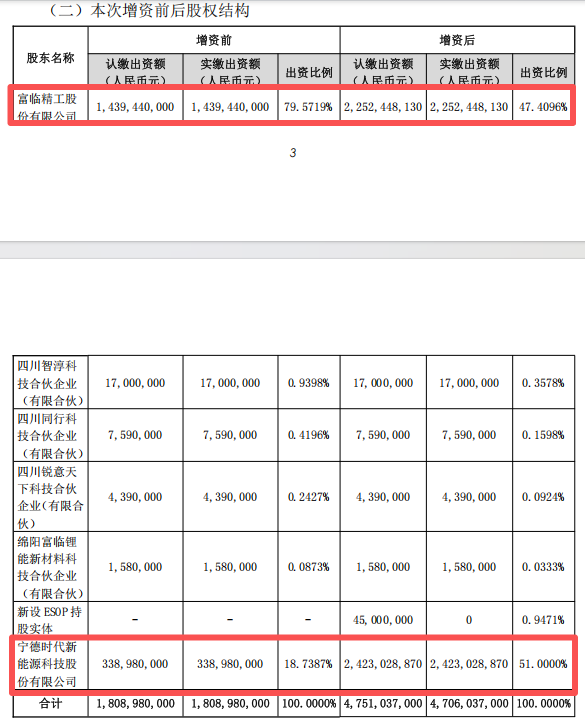 按照增资扩股方案,富临精工拟对江西升华增资10亿元,认购后者新增注册资本8.13亿元;宁德时代拟对江西升华增资25.63亿元,认购后者新增注册资本20.84亿元。 ![]() 实施增资扩股前,富临精工是江西升华的控股股东,持股比例为79.5719%;宁德时代持有江西升华的股权比例为18.7387%。 实施增资扩股后,宁德时代成为江西升华的控股股东,持股比例为51.00%;富临精工持有江西升华的股权比例为47.4096%。 ![]() 同时,宁德时代在经营管理方面掌控江西升华。按照协议,江西升华设立董事会由7名董事组成,其中4名董事由宁德时代委派、3名董事由富临精工委派。江西升华董事长作为法定代表人,由宁德时代委派的董事担任。 江西升华设立经营管理机构负责日常经营管理工作,实行董事会领导下的总经理负责制,设总经理、财务总监各1名,其中财务总监由宁德时代提名的人选担任。 富临精工公告称,江西升华通过本次增资扩股,有利于进一步导入战略股东资源、优化股权结构。 宁德时代主要从事动力电池、储能电池和电池回收利用产品的研发、生产和销售。目前,宁德时代在动力电池、储能领域的市占率均排名全球第一。 截至9月29日收盘,宁德时代A股股价报397.37元/股,涨幅达4.46%,总市值为1.83万亿元。 ![]() 磷酸铁锂行业或将迎来新一轮上升期 富临精工公告称,江西升华通过本次增资扩股获得的增量现金,将用于主业发展提升盈利能力和竞争优势。 富临精工主要业务为汽车发动机零部件、新能源汽车智能电控和新能源锂电正极材料的研发、生产和销售,江西升华是其锂电正极材料板块的实施主体。 近年来,受产能快速投建释放、原材料价格下跌等因素影响,磷酸铁锂行业陷入大面积亏损,在历经一轮“洗牌”后行业格局正在重塑。 以江西升华为例,其2022年、2023年、2024年的营业收入分别为48.79亿元、28.08亿元、48.29亿元,净利润分别为2.88亿元、-10.53亿元、-2836.12万元。 2025年上半年,江西升华的营业收入为39.58亿元,净利润为6378.14万元,主要是出货量持续提升,磷酸铁锂销售收入同比大增。 ![]() 富临精工公告称,江西升华经过多年积累和不断迭代,其高压实密度磷酸铁锂产品具备技术性能优势。 目前,江西升华拥有高压实密度磷酸铁锂产能30万吨。高压实密度磷酸铁锂被称为第四代磷酸铁锂,有助于提升电池快充性能并兼顾高能量密度,在正极材料市场的占比进一步扩大。 中银证券发布研报称,传统磷酸铁锂市场的竞争较为激烈,当前部分落后产能具备出清条件。高压实密度磷酸铁锂对技术要求较高,目前仅有几家头部企业实现批量出货,预计2025年磷酸铁锂市场将向头部和低成本企业进一步集中。