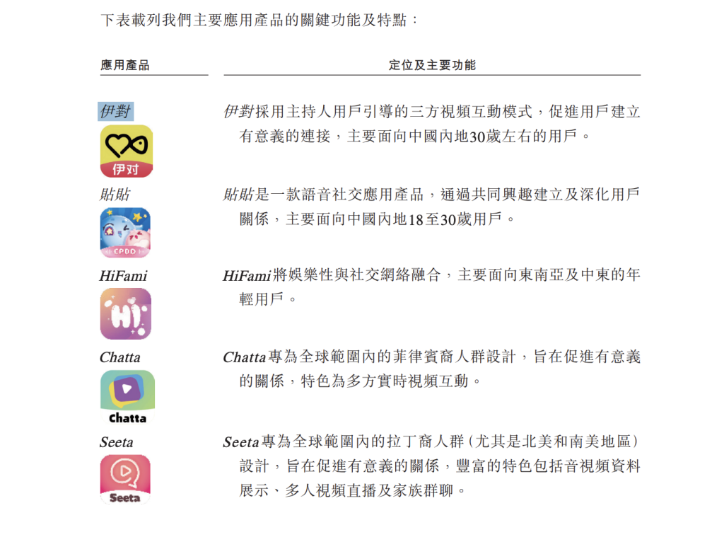 9月29日,港交所披露,米连科技有限公司(简称“米连科技”)向港交所递交招股说明书,冲击香港IPO,华泰国际为其独家保荐人。 招股书揭开了这家拥有“伊对”“贴贴”等产品的企业的经营版图,恋爱相亲软件“伊对”等核心应用成为该公司营收主力,但同时,围绕应用产品的投诉纠纷及争议并未随业务增长而消减。 “伊对”及“贴贴”贡献重要收入 招股书显示,在线情感社交平台公司米连科技成立于2015年,其应用产品涵盖国内外市场,国内包含“伊对”及“贴贴”等主要应用,海外应用产品主要有“HiFami”、“Chatta及Seeta”等。 其中,2017年推出的音视频恋爱社交APP“伊对”,凭借主持人引导的三方视频互动模式,成为该公司绝对支柱。 根据灼识咨询的资料,“伊对”的目标用户为中国内地30岁左右的人群。2025年上半年,“伊对”的平均月活跃用户为480万名,活跃用户月均使用时长8小时,七日留存率为72.1%。按收入计,“伊对”在中国在线情感社交行业排名第一。 ![]() 其他几款应用产品的用户规模与黏性均与“伊对”存在一定差距。以语音社交应用产品“贴贴”为例,该应用于2022年推出,今年上半年,“贴贴”的平均月活跃用户为170万名,七日留存率为43%。海外应用产品矩阵主要面向东南亚、中东、北美及南美等地区的多元化用户群。今年上半年,其所有海外应用产品的平均月活跃用户为350万名,平均月付费用户约30万名,付费转化率为7.5%。 ![]() 从财务数据来看,米连科技2024年的营业收入较过往两年实现了翻倍增长。数据显示,2022年至2024年及今年上半年,米连科技分别实现收入10.523亿元、10.338亿元、23.725亿元及19.166亿元;盈利端则从2022年、2023年的亏损到2024年录得净利润1.456亿元,今年上半年,其净利润进一步增至2.618亿元。 但招股书明确提示,公司大部分收入来自数量有限的应用产品,“伊对”及“贴贴”是收入的重要贡献者。若核心产品有任何负面发展均可能对本公司的整体财务及经营业绩造成重大不利影响。同时,“伊对”及“贴贴”的表现可能因法律及法规变动而受到不利影响,例如对数据安全、用户隐私或内容审核提出更严格要求;不遵守这些规定可能会导致罚款、运营限制或从应用商店下架等。