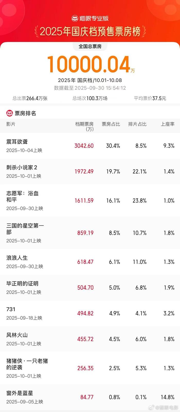 据猫眼专业版数据,截至9月20日15时54分,2025国庆档档期预售总票房突破亿。《震耳欲聋》《刺杀小说家2》《志愿军:浴血和平》分列国庆档预售榜前三位。
