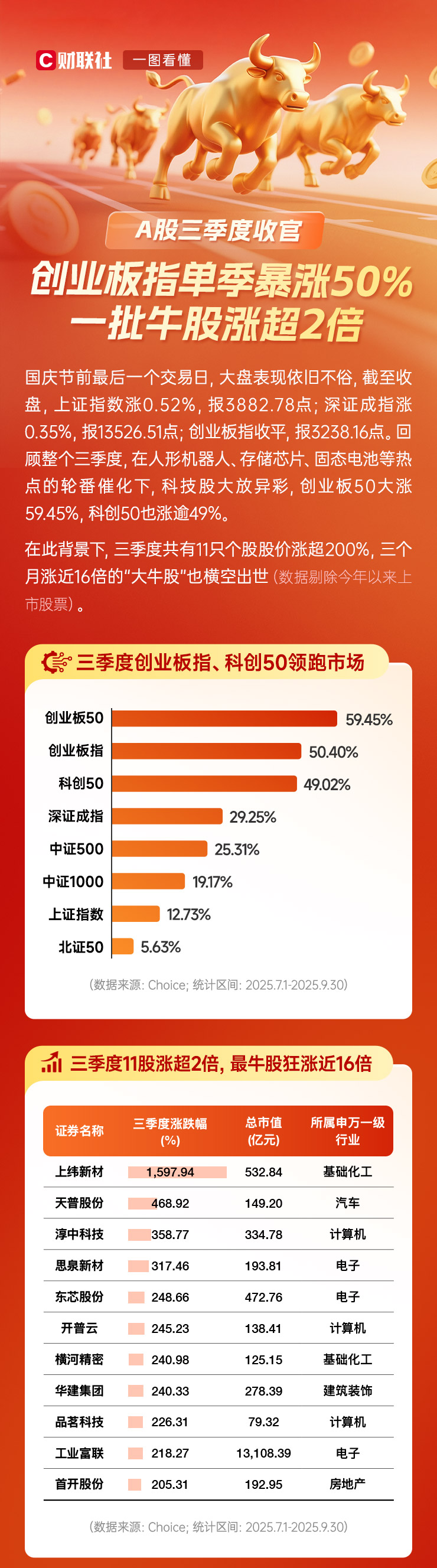 回顾整个三季度,在人形机器人、存储芯片、固态电池等热点的轮番催化下,科技股大放异彩,创业板50大涨59.45%;同期共有11只个股股价涨超200%。