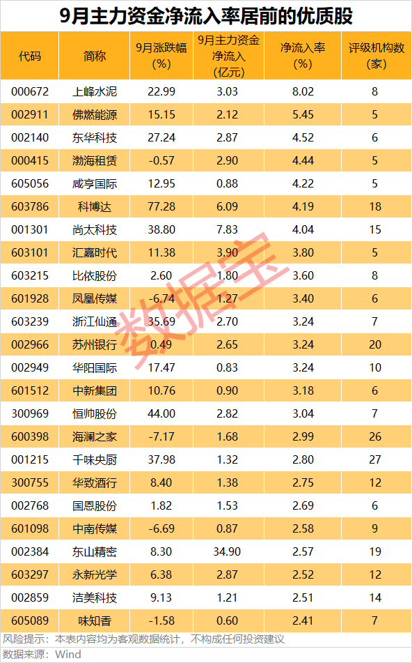 9月赚钱效应如何? 9月A股市场在波动中上扬,上证指数月度累计上涨0.64%,创业板指大涨超12%,科创50指数大涨超11%。板块方面,电力设备飙升超21%,有色金属、电子等板块指数均涨超11%。 展望节后,华龙证券认为市场具备向上动能。首先,政策持续发力稳定基本面向好预期,上市公司盈利总体处于改善通道中。其次,政策稳定市场预期明确。最后,市场总体估值合理,且在盈利预期上行的情况下,有望支撑市场估值扩张。尽管近期市场有所波动,但风险偏好仍较高,当前内外资对市场仍保持积极。 9月最熊股暴跌超86% 从个股表现来看,9月有3300多只个股下跌。其中,最熊股票是紫天退(300280),9月累计暴跌超86%,股价频频创出历史新低。 9月5日晚间,公司发布公告称,公司于2025年9月5日收到深圳证券交易所(以下简称“深交所”)下发的《关于福建紫天传媒科技股份有限公司股票终止上市的决定》(深证上〔2025〕968号),深交所决定终止公司股票上市交易。 ![]() 股价重挫的还有ST东通和ST高鸿,9月累计跌幅均超63%。 其中,*ST东通9月12日晚间发布公告,公司因涉嫌定期报告等财务数据存在虚假记载,被中国证监会立案调查。公司于2025年9月12日收到中国证监会下发的《告知书》。根据《告知书》认定的事实,公司2022年向特定对象发行股票构成欺诈发行、2019年至2022年度报告存在虚假记载,可能触及《深圳证券交易所创业板股票上市规则》第10.5.1条第(一)项、第10.5.2条第一款第(六)项规定的重大违法强制退市的情形,可能被实施重大违法强制退市。 9股9月股价翻倍 A股市场中,9月有多达9只个股股价翻倍。其中,首开股份涨幅超过181%,居首;海博思创、品茗科技等均涨超130%。 海博思创股价大涨主要因为储能题材的爆发。资料显示,海博思创是国内领先的电化学储能系统解决方案与技术服务提供商,专注于电化学储能系统的研发、生产、销售,为传统发电、新能源发电、智能电网、终端电力用户等“源—网—荷”全链条行业客户提供全系列储能系统产品,提供储能系统一站式整体解决方案。 ![]() 两只存储芯片概念股翻倍上涨,包括德明利、香农芯创等。消息面上,9月存储市场的第二轮涨价“信号枪”再度打响。其中闪迪宣布将面向所有渠道和消费者客户的产品价格上调10%以上。近日,美光科技向渠道商发出通知,宣布其存储产品价格将上涨20%—30%。从9月12日起,所有DDR4、DDR5、LPDDR4、LPDDR5等存储产品全部停止报价,协议客户价格全部取消,暂停报价一周。 主力资金大幅抢筹的优质股曝光 据证券时报·数据宝统计,从个股9月的主力资金流向来看,10股累计净流入均超10亿元,东山精密、天际股份、凯美特气等“吸金”均超19亿元,长盈精密、香农芯创、兆易创新等获净流入均超13亿元。 一批机构关注度较高且主力资金净流入率较高的个股值得关注。数据显示,5家及以上机构评级个股中,上峰水泥主力资金净流入率居首,超过8%,该股9月累计涨幅接近23%。 此外,还有佛燃能源、东华科技、渤海租赁等个股主力资金净流入率居前。 ![]()