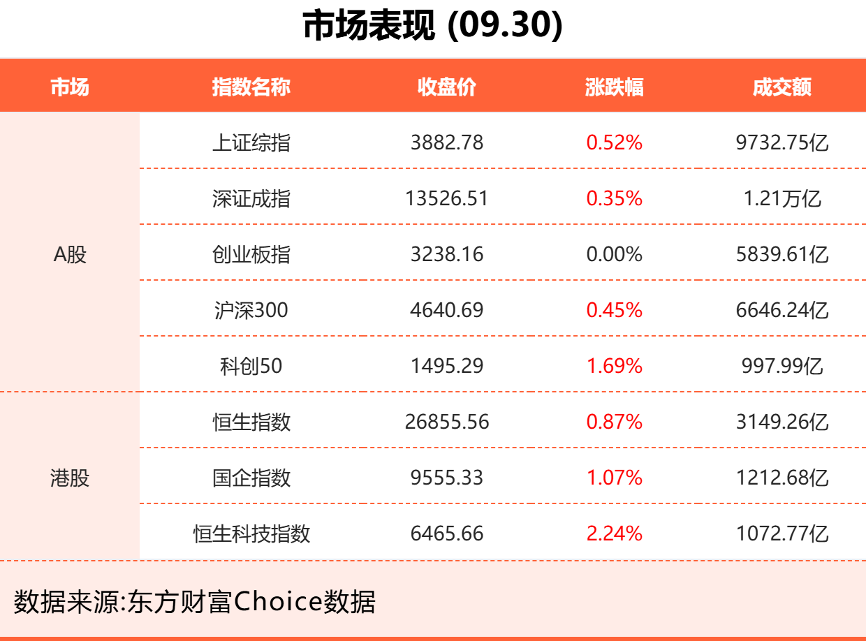 主题机会铜: 美国矿业巨头自由港麦克莫兰日前宣布,受格拉斯伯格铜矿泥石流事故影响,预计公司第三季度铜销量将同比下降约4%,明年产量可能较原计划下降约35%,格拉斯伯格铜矿是全球产量第二大的铜矿。当前铜价的连续上涨也反映出全球供应的脆弱性,在交通电气化、AI驱动的数据中心热潮以及可再生能源的推动下,铜金属需求在快速增长。 截至9月30日收盘,金属铜概念上涨3.34%,板块内,71股上涨,盛屯矿业、江西铜业、河钢资源等涨停,湖南裕能、华锡有色、华友钴业等涨幅居前,分别上涨12.01%、9.98%、9.38%。跌幅居前的有卧龙新能、海亮股份、四川路桥等,分别下跌2.94%、1.89%、1.82%。 资金面上看,今日金属铜概念板块获主力资金净流入20.52亿元,其中,37股获主力资金净流入,12股主力资金净流入超亿元,净流入资金居首的是华友钴业,今日主力资金净流入7.19亿元,净流入资金居前的还有锡业股份、中国中冶、盛屯矿业等,主力资金分别净流入4.40亿元、4.38亿元、3.47亿元。 存储芯片: 据CFM闪存市场最新预测,2025年下半年在DDR4、DDR5、HBM3E等DRAM ASP及bit出货齐增的强驱动力下,加上NAND单价持续回稳,预计2025年全球存储市场规模合计高达1932亿美元,将创下历史最高记录。据分析,AI服务器为代表的AI相关的存储应用需求持续旺盛,原厂存储供应增长有限,导致NAND和DRAM均出现不同程度上的结构性供应短缺,有望全面推升第四季度存储价格上行。 截至9月30日收盘,存储芯片概念上涨2.80%,板块内,91股上涨,江波龙20%涨停,德明利、深科技等涨停,华虹公司、灿芯股份、恒烁股份等涨幅居前,分别上涨15.72%、15.41%、11.88%。跌幅居前的有京仪装备、江丰电子、东芯股份等,分别下跌6.21%、4.86%、3.29%。 资金面上看,今日存储芯片概念板块获主力资金净流入42.63亿元,其中,69股获主力资金净流入,16股主力资金净流入超亿元,净流入资金居首的是兆易创新,今日主力资金净流入14.78亿元,净流入资金居前的还有长电科技、深科技、江波龙等,主力资金分别净流入7.57亿元、6.86亿元、4.50亿元。 公司新闻海南华铁:全资子公司海南华铁大黄蜂建筑机械设备有限公司与杭州X公司签署的《算力服务协议》终止。原协议约定提供5年算力服务,总金额36.9亿元。由于市场环境及供需变化,且未收到采购订单,公司决定解除协议。上交所就此事向海南华铁下发监管工作函,就公司重大合同终止相关事项明确监管要求。涉及对象:上市公司,董事,监事,高级管理人员。 寒武纪:本次定增发行价格为1195.02元/股,发行对象确定为13家,发行股数333.49万股,募集资金总额39.85亿元。募集资金将用于面向大模型的芯片平台项目、面向大模型的软件平台项目及补充流动资金。 新易盛:公司控股股东及实际控制人之一高光荣计划通过询价转让方式转让1143.07万股,占公司总股本的1.15%,转让原因为自身资金需求。转让价格下限为发送认购邀请书前20个交易日股票交易均价的70%。受让方为具备相应定价能力和风险承受能力的机构投资者。 丰山集团:公司目前主营业务仍以原药及制剂的生产、研发、销售为主,公司主营业务未发生变化,且公司控股子公司丰山全诺目前主要销售锂离子电解液,钠离子电解液占比相对较小,且销售不涉及固态电池电解质材料。此外,关于清华大学张强教授团队近期发表的重要研究成果,与我公司委托其开展的研究开发项目并非同一项研发项目。目前,公司与清华大学合作处于初步研究开发启动阶段,合同金额较小。 剑桥科技:中国证监会国际合作司发布关于上海剑桥科技股份有限公司境外发行上市备案通知书,公司拟发行不超过7706.2万股境外上市普通股并在香港联合交易所上市。 有研新材:有投资者在互动平台向有研粉材提问,请问公司散热铜粉已用于昇腾系列910芯片,是否独家供应?有研粉材回复称,用于昇腾芯片的该款高性能散热铜粉为公司独供。 蜂助手:本次向特定对象发行股票的发行对象为包括公司控股股东、实际控制人罗洪鹏在内不超过35名(含35名)特定投资者,本次发行的募集资金总额不超过9.84亿元(含本数),扣除发行费用后的募集资金净额将全部用于云终端算力中心项目、物联网终端智能化升级项目、瘦终端SoC芯片技术研发项目。 德福科技:针对半/全固态电池,公司已研发出雾化铜箔、芯箔等多款新型铜箔作为解决方案,且2025年上半年应用于固态电池用铜箔出货量超140吨。 三一重工:中国证监会国际合作司发布关于三一重工股份有限公司境外发行上市备案通知书,公司拟发行不超过10.83亿股境外上市普通股并在香港联合交易所上市。 电投产融:公司拟通过资产置换和发行股份方式购买国电投核能有限公司100%股权,同时置出国家电投集团资本控股有限公司100%股权,并募集配套资金。公司于2025年9月30日收到深交所的通知,因公司本次交易申请文件中记载的财务资料及评估资料已过有效期,需要补充提交,按照《深圳证券交易所上市公司重大资产重组审核规则》的相关规定,深交所对公司本次交易中止审核。 央视新闻联播 国家统计局、中国物流与采购联合会今天(9月30日)联合公布,9月份中国制造业采购经理指数为49.8%,比上月上升0.4个百分点。指数连续两个月环比上升,制造业景气水平继续改善。生产指数连续两个月环比上升,制造业整体生产活动加快扩张。市场需求景气度有所改善,