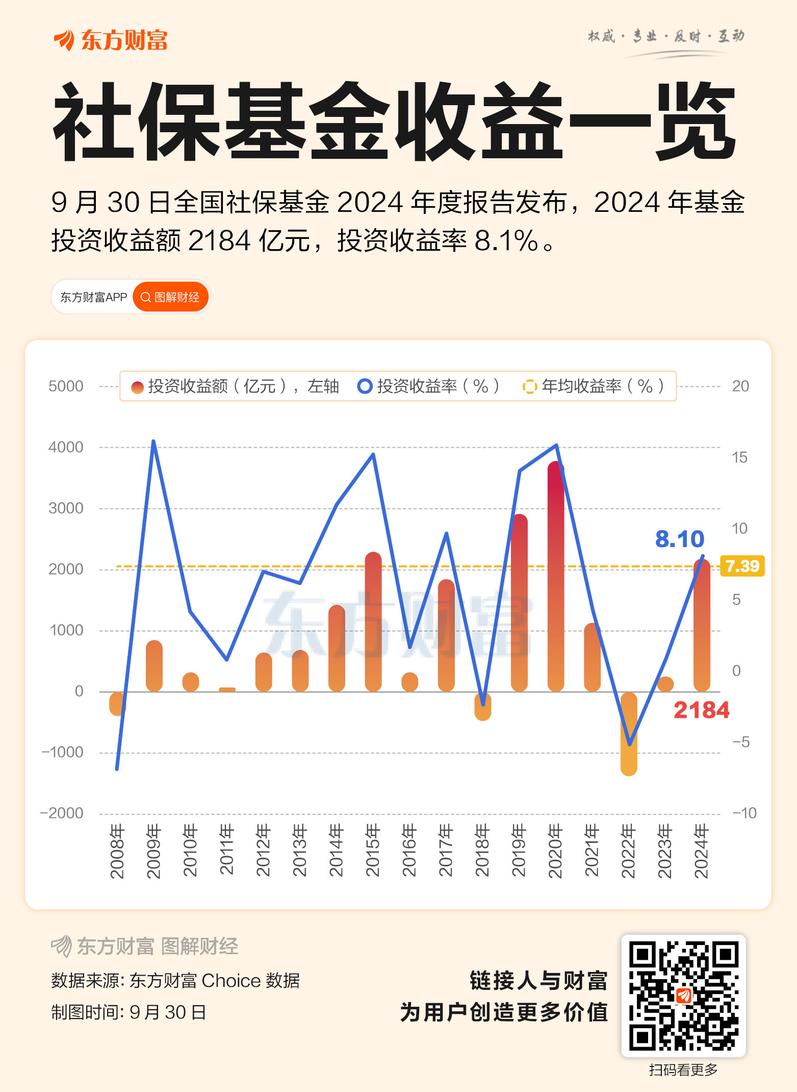 ![]() 9月30日,全国社会保障基金理事会发布了《全国社会保障基金2024年度报告》(下称《报告》)。 《报告》显示,截至2024年末,基金资产总额达3.32万亿元。2024年全国社保基金投资收益额为2184亿元,投资收益率达8.10%,自2000年成立以来累计投资收益额为1.9万亿元,年均收益率达7.39%。 东方财富Choice数据显示,2008年至2024年17年间,社保基金投资收益为正的年份有14个,仅有3个年份投资收益为负。其中投资收益额最高的是2020年,达3787亿元,投资收益率最高的是2009年,达16.12%。 全国社会保障基金理事会有关负责人介绍,2024年,面对外部压力加大、资本市场波动加剧的严峻形势,全国社会保障基金理事会着力健全风险防控体系,稳妥抓好基金投资运营,扎实履行基金安全和保值增值主体责任,基金取得较好投资业绩。 此外,有关负责人还表示,全国社会保障基金理事会坚持并持续丰富“长期投资、价值投资、责任投资”理念,审慎稳健开展投资运营管理,忠实履行好基金安全和保值增值主体责任。