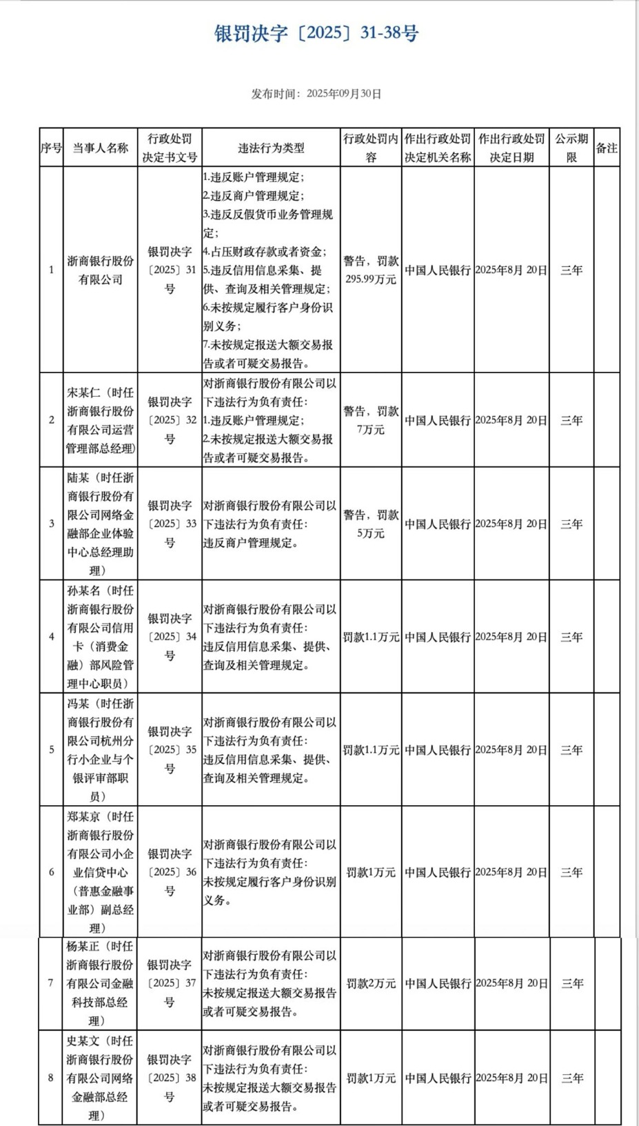 因占压财政存款或者资金等7项违法行为类型,浙商银行股份有限公司(下称“浙商银行”)被警告并罚款295.99万元,7名责任人同步领罚。 9月30日,中国人民银行行政处罚公示显示,浙商银行被警告并处罚款295.99万元,涉及的违法行为类型包括:违反账户管理规定;违反商户管理规定;违反反假货币业务管理规定;占压财政存款或者资金;违反信用信息采集、提供、查询及相关管理规定;未按规定履行客户身份识别义务;未按规定报送大额交易报告或者可疑交易报告。作出行政处罚的决定日期为8月20日。 ![]() 同时,有7名责任人领罚。 具体看,时任浙商银行运营管理部总经理宋某仁被警告并处罚款7万元,对浙商银行违反账户管理规定、未按规定报送大额交易报告或者可疑交易报告负有责任; 时任浙商银行网络金融部企业体验中心总经理助理陆某被警告并处罚款5万元,对浙商银行违反商户管理规定负有责任; 时任浙商银行信用卡(消费金融)部风险管理中心职员孙某名、时任浙商银行杭州分行小企业与个银评审部职员冯某分别被罚款1.1万元,对浙商银行违反信用信息采集、提供、查询及相关管理规定负有责任; 时任浙商银行小企业信贷中心(普惠金融事业部)副总经理郑某京被罚款1万元,对浙商银行未按规定履行客户身份识别义务负有责任; 时任浙商银行金融科技部总经理杨某正被罚款2万元,时任浙商银行网络金融部总经理史某文被罚款1万元,二人均对浙商银行未按规定报送大额交易报告或者可疑交易报告负有责任。 浙商银行2025年半年度报告显示,2025年上半年,浙商银行实现营业收入332.48亿元,同比下降5.76%;实现归母净利润76.67亿元,同比下降4.15%。截至2025年6月末,浙商银行资产总额33464.85亿元;不良贷款255.45亿元,比上年末增加0.51亿元,不良贷款率1.36%,比上年末下降0.02个百分点。 浙商银行是十二家全国性股份制商业银行之一,于2004年8月18日正式开业,总部设在浙江杭州,系全国第13家“A+H”上市银行。