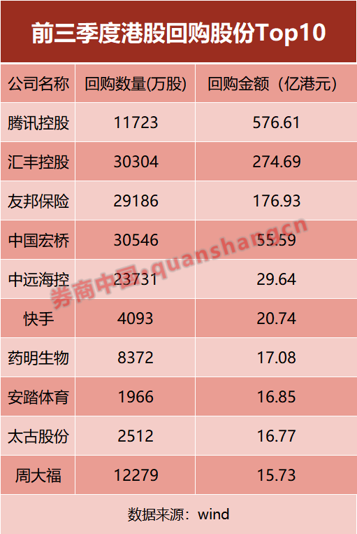 前三季度港股回购数据出炉。 券商中国记者根据数据统计,今年1月1日至9月30日,合计有231家港股上市公司累计回购了56.57亿股,回购金额达到1367亿港元,参与回购的上市公司家数和回购数量以及回购金额同比增速均回落。 值得一提的是,从行业来看,互联网科技行业与金融行业主导回购趋势,腾讯、汇丰控股、友邦保险三家企业回购金额均在百亿港元以上,占前三季度港股回购总金额的75%,腾讯以576.61亿港元回购金额继续稳坐港股“回购王”。 10月2日,腾讯控股股价盘中刷出四年半来新高,最高探至683港元/股,涨幅一度超过3%。 港股回购节奏放缓 今年以来,港股估值提升,多家上市公司股价大幅上涨,整体回购节奏有所放缓。 数据显示,今年前三季度,合计共有231家港股上市公司累计回购了56.57亿股,回购金额达到1367亿港元,参与回购的上市公司家数和回购股票数量均同比下降。2024年前三季度,合计有242家港股上市公司累计回购了76.64亿股,回购金额2124.71亿港元。 实际上,从近年来回购数来看,2024年回购金额也属于历史高位,数据显示,2022年、2023年和2024年港股全年上市公司回购总金额分别为1034亿港元、1251亿港元和2649亿港元。 从今年前三季度回购金额Top10公司来看,除了互联网科技企业腾讯控股和快手,还有来自金融行业的汇丰控股和友邦保险,以及医药、服装等行业,前十家公司合计回购金额达到1200亿港元,占今年前三季度港股回购金额总额约88%。 ![]()