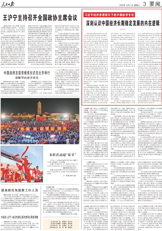 9月30日起,《人民日报》连续五天刊发“钟才文”署名评论,关注中国经济这一核心议题,对当前经济形势进行权威解读,凝聚社会共识,指引未来发展方向。 该组评论文章被统率在“习近平经济思想指引下的中国经济专论”栏目之下,均发表于《人民日报》要闻版,其中部分篇目还发表于头版,受到国内外舆论场高度关注。 ![]() 10月4日,《人民日报》最新一篇“钟才文”专论题为《全面认识把握中国经济高质量发展的确定性》,明确指出中国经济高质量发展的确定性来源于中国在发展战略、宏观政策、市场潜力、市场空间、发展韧性以及投资环境等方面。 评论指出,长期以来,我们党带领全体人民推进现代化建设,通过中长期规划来指导经济社会发展,战略目标和短期目标相互叠加,坚持一张蓝图绘到底。我国先后制定并实施了14个五年规划(计划),不求毕其功于一役,而是一茬接着一茬干,芝麻开花节节高。反观一些西方国家,在国家大政方针上摇摆不定,翻手为云、覆手为雨,甚至开历史的“倒车”。 此外,无论外部环境如何复杂多变,中国的宏观政策始终坚持稳中求进工作总基调,坚持遵循经济规律,在保持财政、货币等宏观政策连续性稳定性基础上,根据形势变化适时、适度调整政策力度和方向。宏观政策调整注重长周期和战略考量,而不只是看眼前短期利益、局部利益。 今年以来,面对美国滥施所谓“对等关税”,中国多措并举帮扶受关税影响企业,上半年实现经济增长5.3%,承受住了贸易保护主义和外需收缩的双重压力。这一数据清晰说明,中国经济是一艘巨轮,而不是一条小舢板,发展韧性强、潜力大、活力足,有足够能力和底气应对内外部风险挑战。 ![]() 此前,发表于9月30日的首篇评论《从全球视角看新时代中国经济的跨越与蝶变》指出,在以习近平同志为核心的党中央坚强领导下,在习近平经济思想指引下,中国经济始终保持战略定力,坚持高质量发展不动摇,着力构建新发展格局,走出了一条与世界其他主要经济体形成鲜明对比的稳健发展之路,在充满不确定的世界里,展现出强大韧性和活力,实现了历史性的跨越和蝶变。 ![]() 10月1日,“钟才文”评论《深刻认识中国经济长期稳定发展的内在逻辑》系统总结了支撑中国经济行稳致远的六大要素:坚持党的领导;理论体系与时俱进、不断创新;战略规划引领和有效宏观调控相结合;坚持以人民为中心的发展思想、充分调动各方面积极性;社会主义市场经济适应生产力发展需要;超大规模市场和创新驱动发展相互促进、良性循环。 ![]() 10月2日的评论《科学客观看待我国当前经济发展态势》直面我国经济形势中的分化,指出看经济要坚持两点论,用好辩证法。总的看,我国经济形有分化、势在向好、未来可期。评论指出,产业转型升级不是一个齐头并进的过程,不是“齐步走”,而是有快有慢、有先有后,不同区域、行业、群体会出现分化,宏观数据同部分微观主体感受会有“温差”。对此,我们要全面看待,不能因为部分经营主体感受不好就否定整体经济形势,不能“只见树木、不见森林”。同时,我们要通过改革发力、政策给力,着力缩小“温差”,努力让广大人民群众享受发展红利。 ![]() 当前,国际国内有一些声音认为,在中国,投资和发展已经过了黄金阶段,机会变少。10月3日,评论《中国经济转型升级蕴含重大机遇》则明确驳斥了这样的观点,指出中国从不缺乏投资机会和市场空间,中国经济加快转型升级,蕴含产业升级、科技创新与人才红利、消费扩容升级、传统与新型基础设施建设、新型城镇化与城市更新、保障和改善民生等六大机遇,将为世界各国带来前所未有的重大机遇。